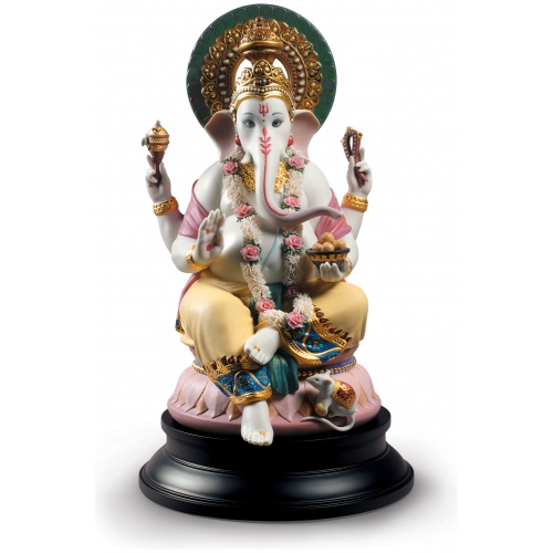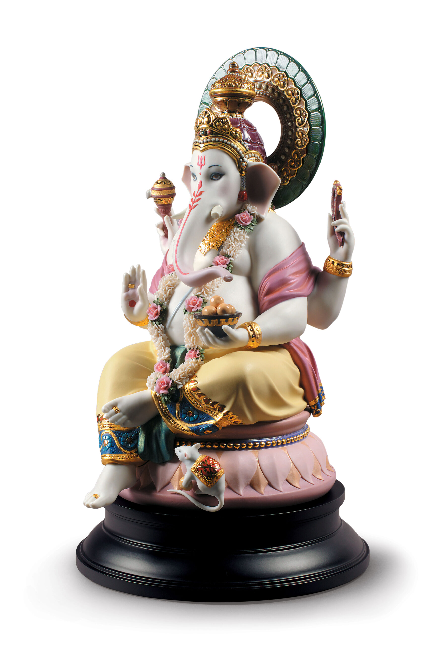 The legend goes that Ganesha, the son of Shiva and Parvati, was born while his father was fighting against the Asuras or devils. When he returned from war, Ganesha did not recognize him and a fight broke out between the two in which Shiva beheaded his son. Shiva went down to earth with the promise of giving his son the head of another being and it turned out to be an elephant. Believed to be the eliminator of obstacles, Lord Ganesha transcends its hug importance in the Hindu culture and becomes a universal symbol of wisdom. Lladró’s artists have recreated the Hindu god of wisdom and knowledge in a winning combination of matte porcelain with enamels, golden luster in various different parts of the piece plus metallic effects paying tribute to the wealth of its iconography. Particularly outstanding is the highly elaborate ornamentation, which features an exquisite filigree work enriching every detail of the piece, including an elaborate garland of over 206 delicate flowers, one of the brand?s signature elements.
