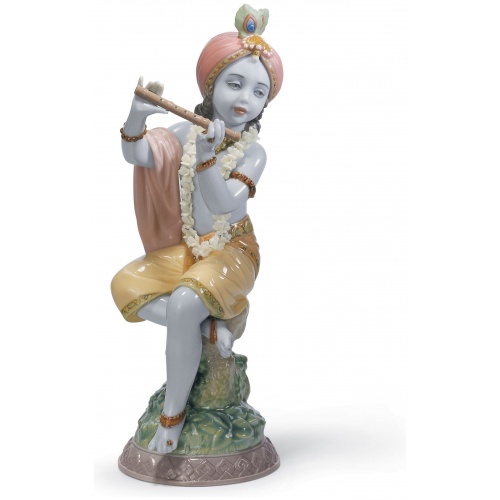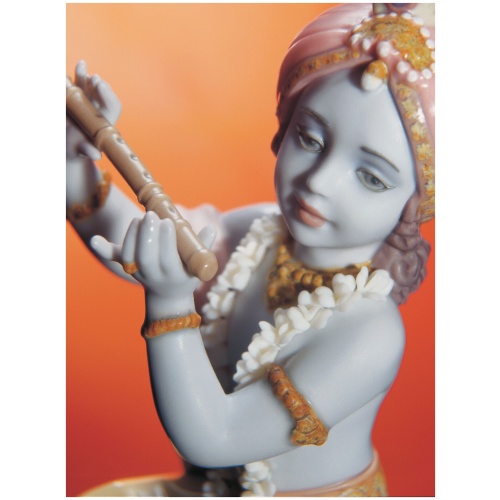 This precious representation, beautifully embellished with a flower necklace, shows the Lord Krishna playing a flute. Krishna is one of the most revered gods of Hinduism. He himself said: whenever righteousness declines and injustice increases, I appear. Executed in gloss porcelain, the exquisite colour palette used in this creation and the delicate expression of the young god´s face are highlighted.