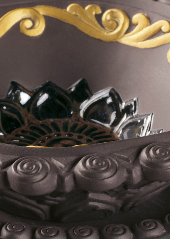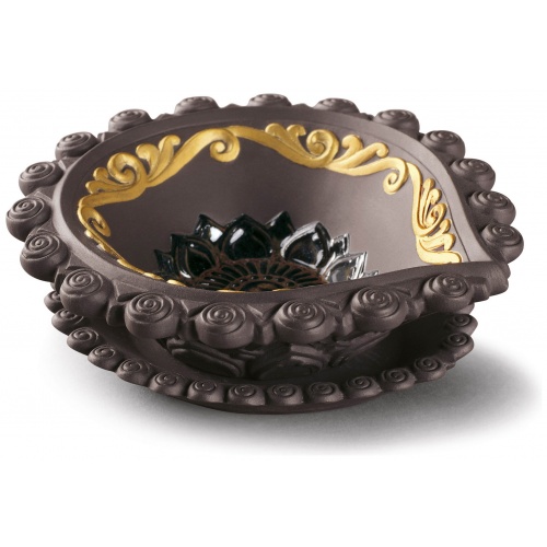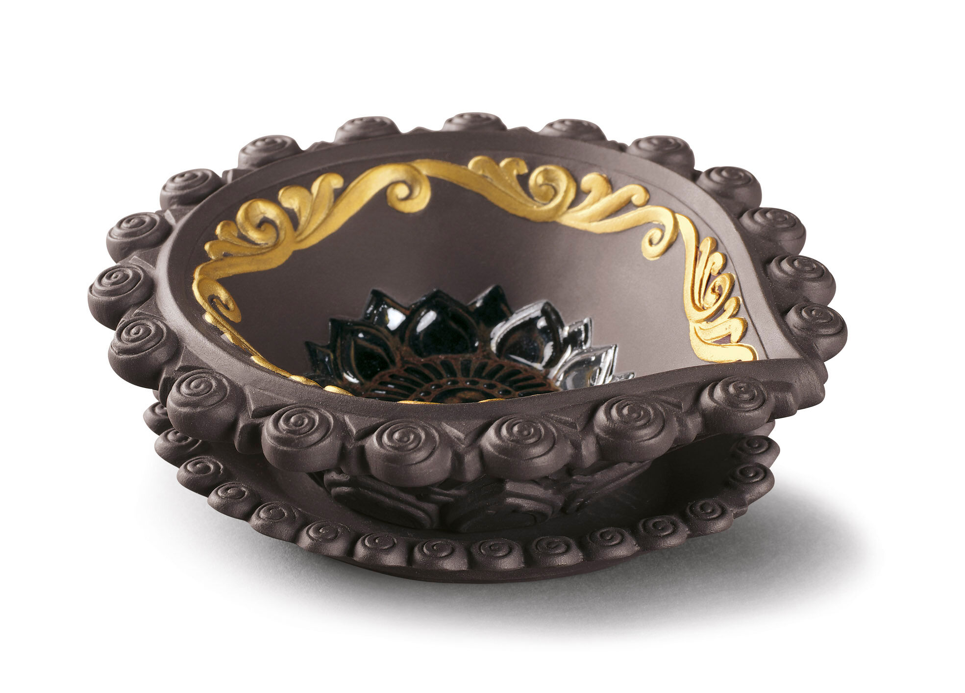 The diya is an oil lamp for offerings, inspired by Hindu religious and iconographic traditions. It is finished in matte porcelain and decorated in brown-black with enamel and gold luster on the interior. This piece is available individually and as an optional complement to the Lord Shiva piece (01001981).