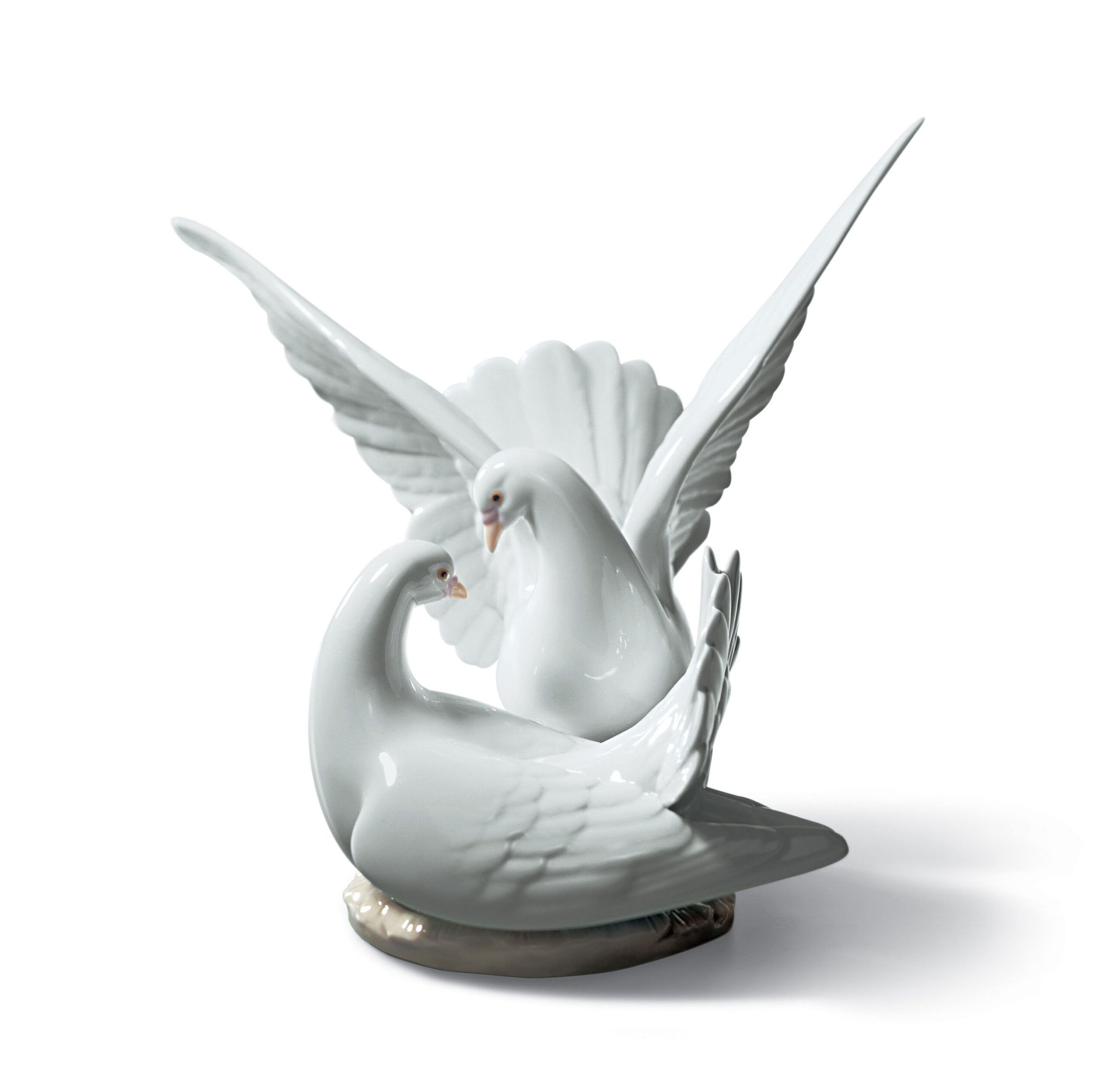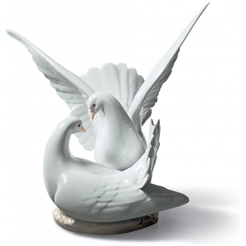 A symbol of eternal love, this pair of pigeons that softly serenade each other forms a beautiful composition. A piece of glossy porcelain, decorated in soft pastel colours, perfect as a declaration of love or to celebrate an anniversary.