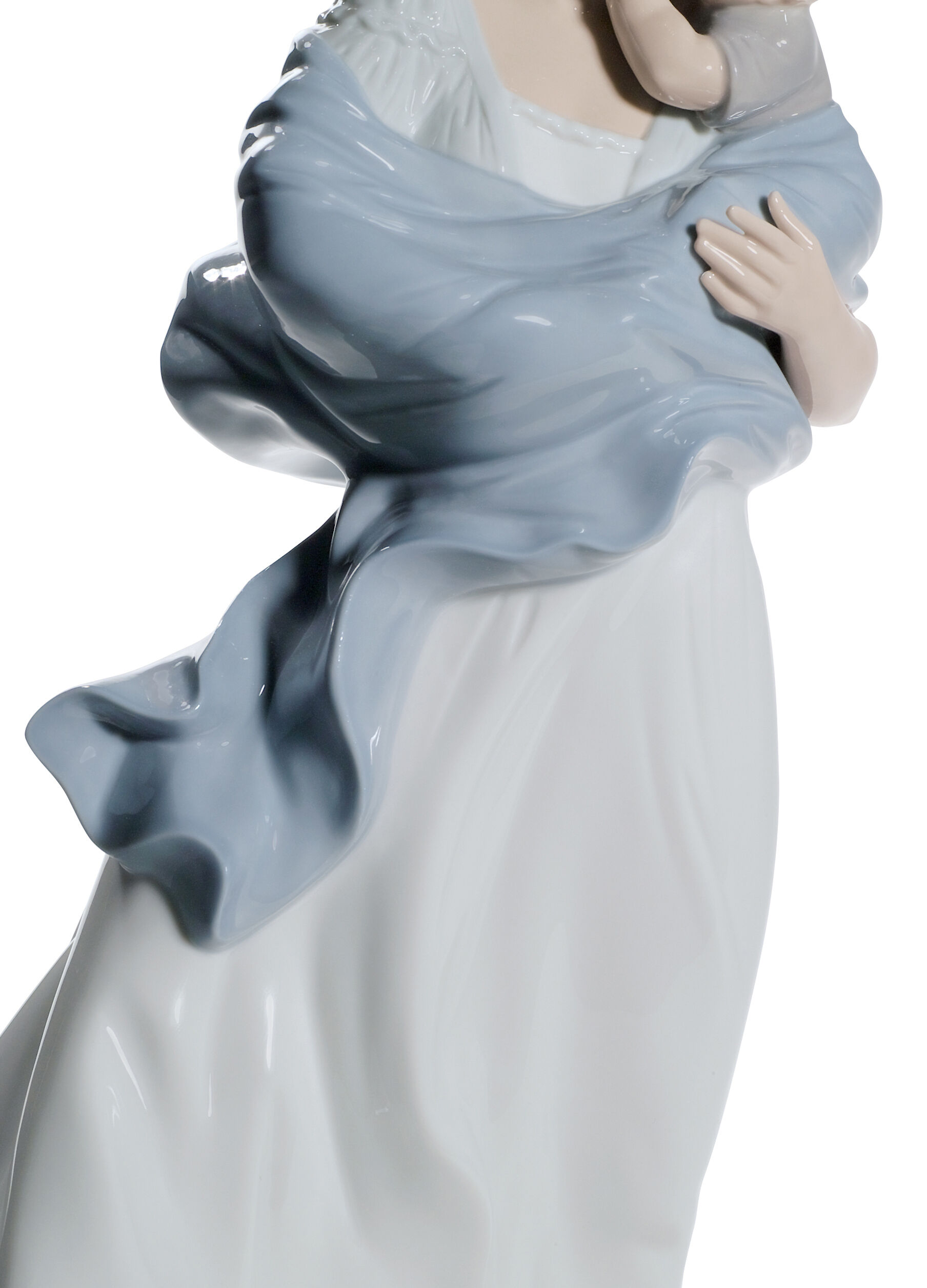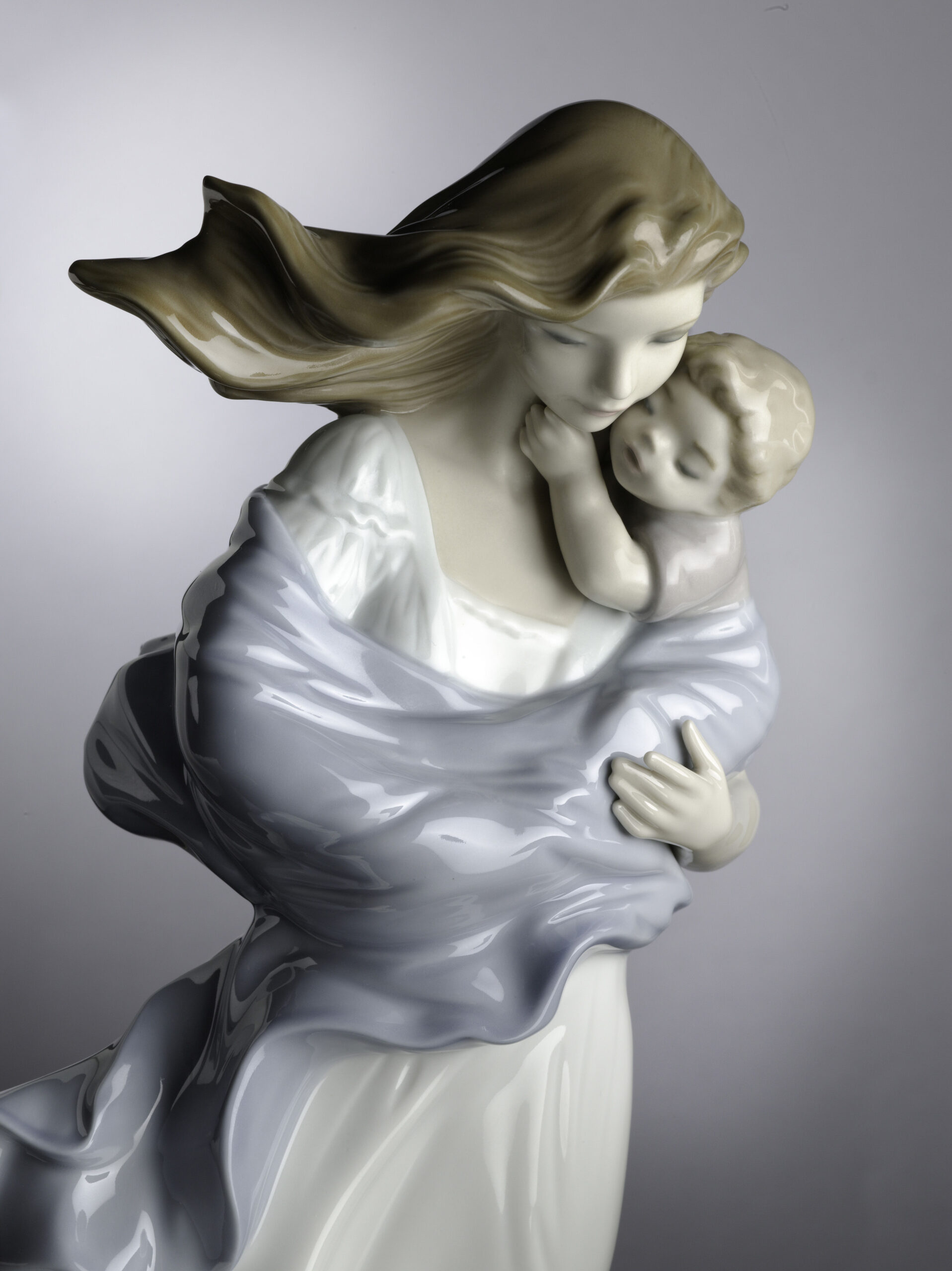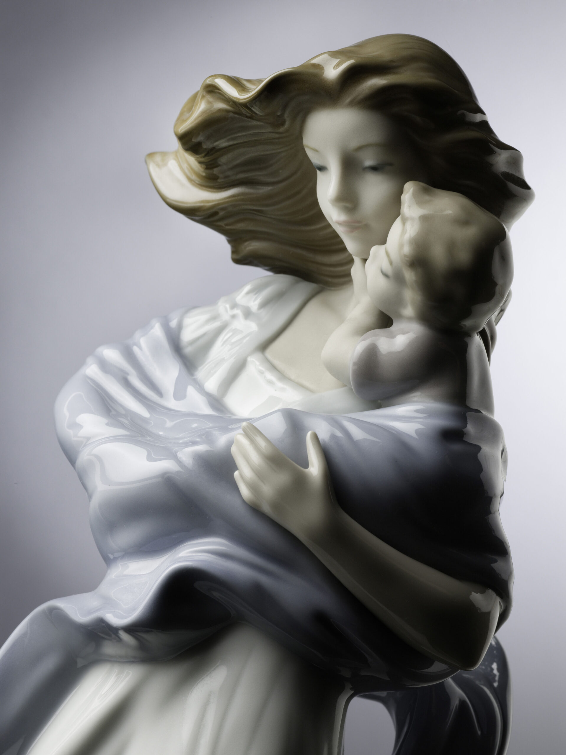A romantic vision of motherhood. As the breeze billows the hair and clothes, the child finds shelter, warmth and tenderness in her mother. A piece of glossy porcelain, decorated in pastel colours, ideal as a gift, collectible or decoration.