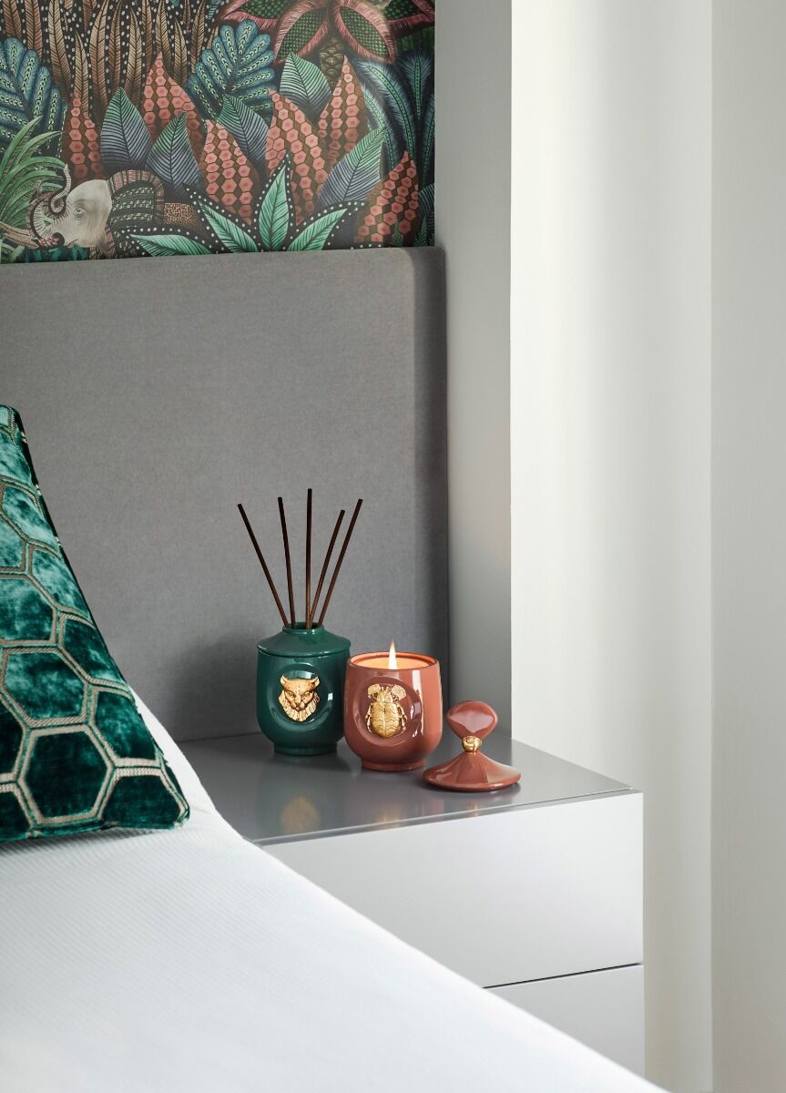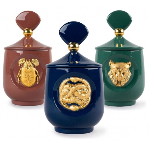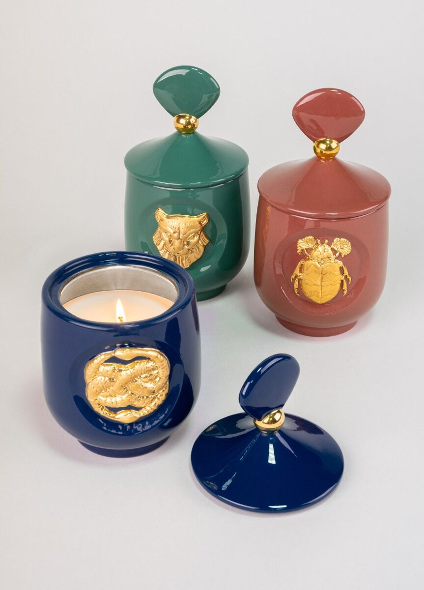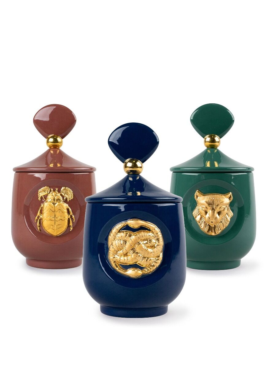 Celebrating the incredible variety of the animal kingdom, the Luxurious Animals collection is the latest addition to the world of home fragrances. Porcelain holders on which different animals have been finely etched by hand and painted with golden luster. Each candle, decorated with a scarab, a serpent and a lynx, contains 500 grs of natural wax and two wicks. The scents in this set are:
