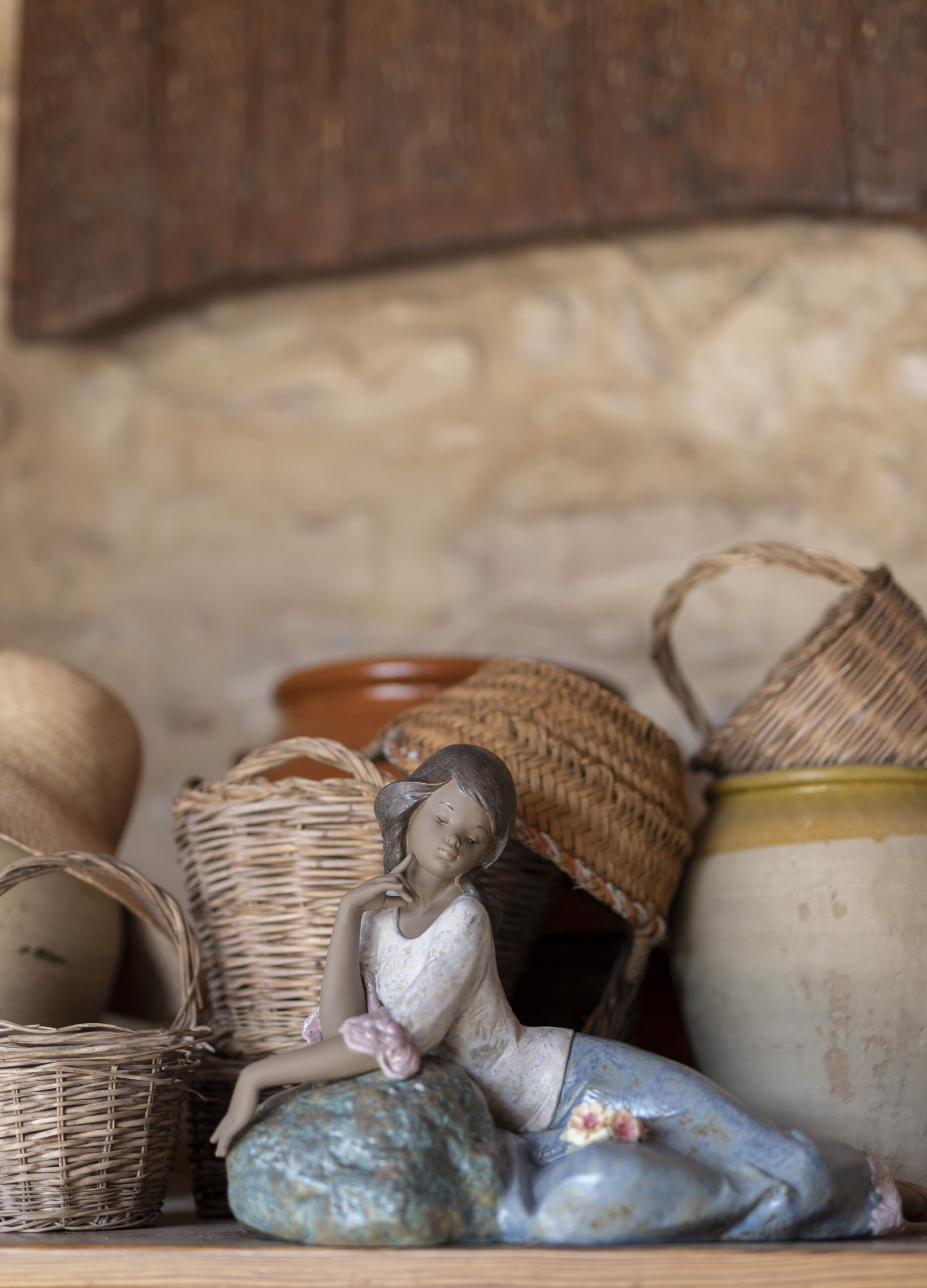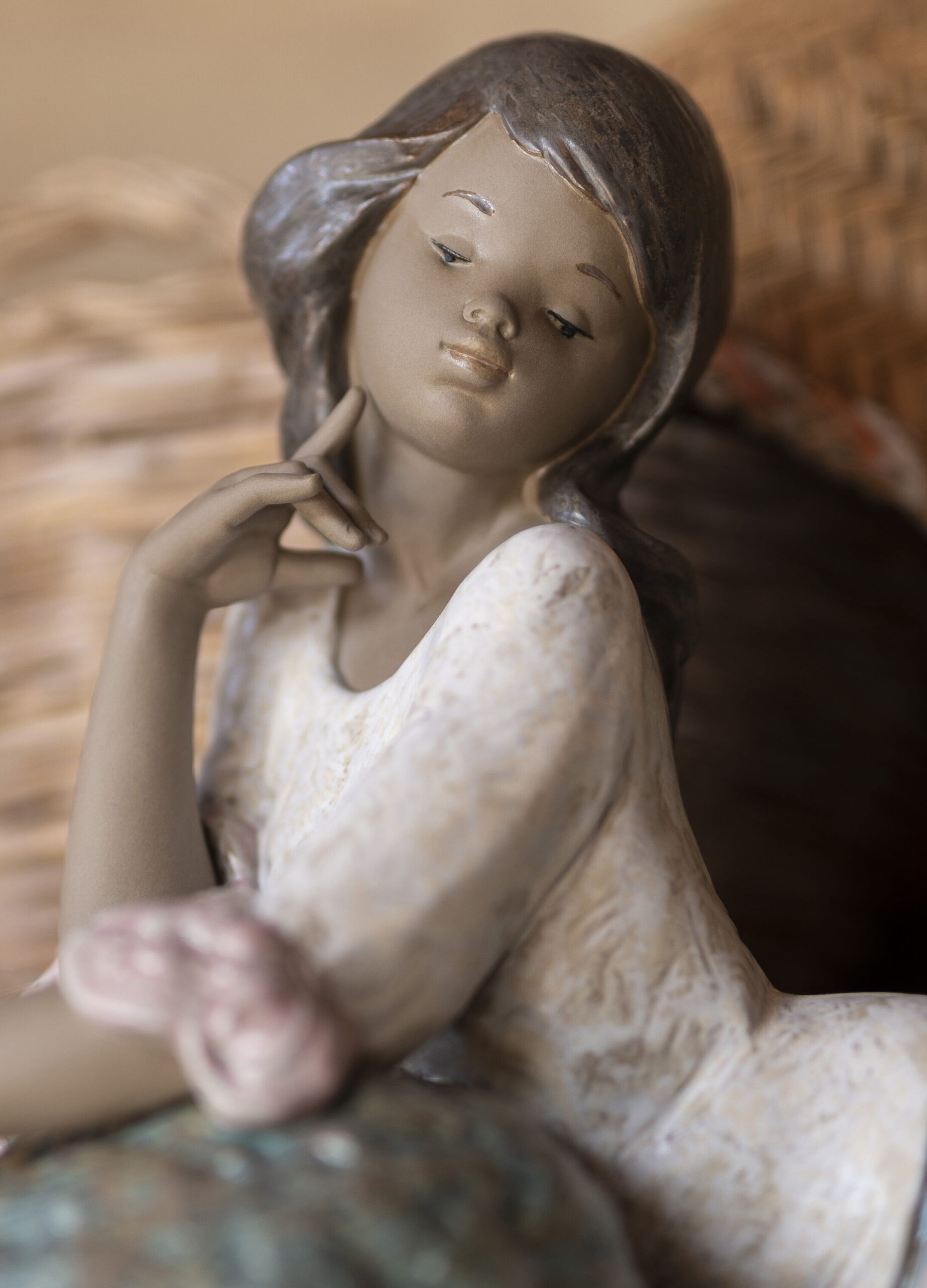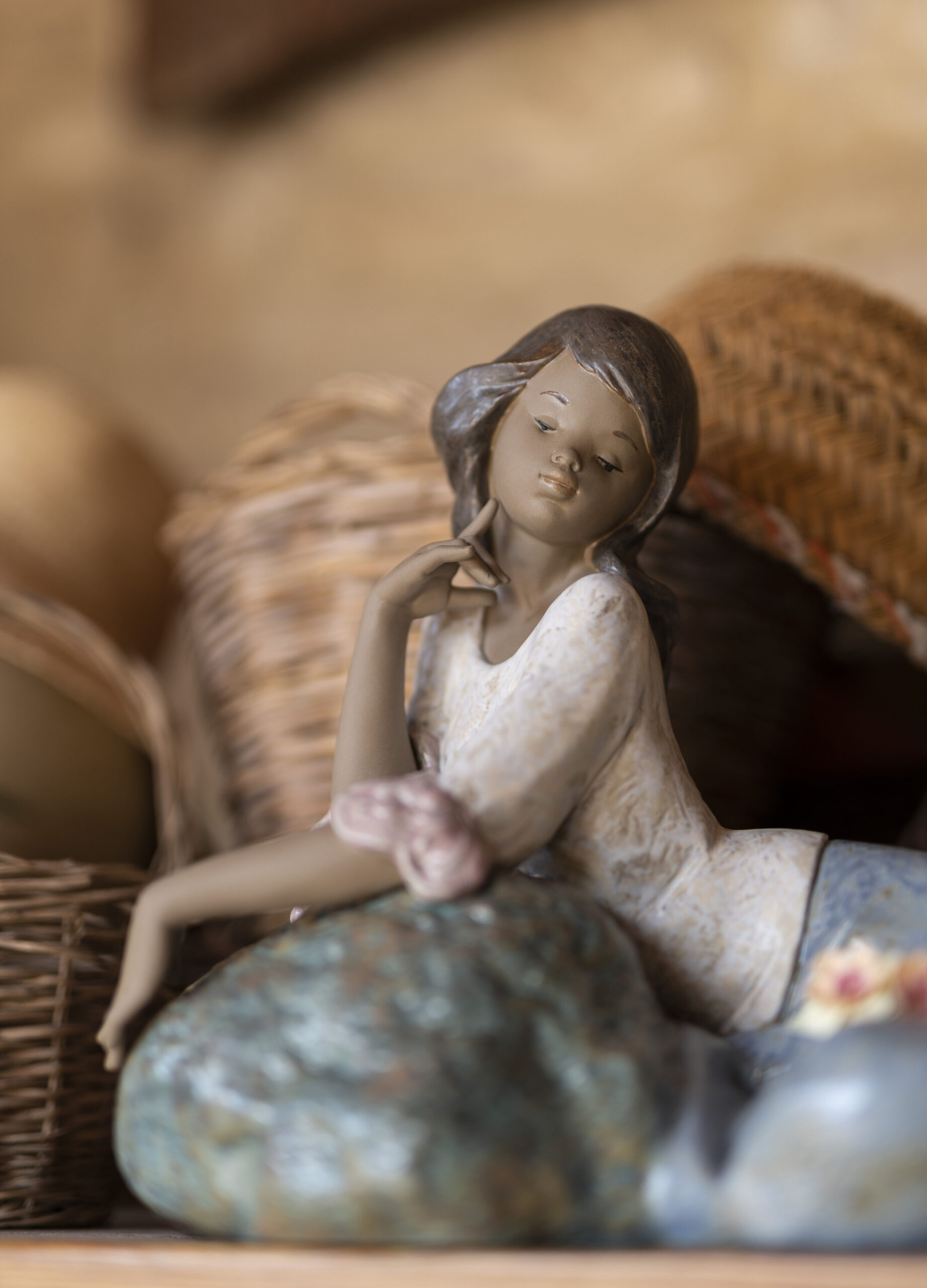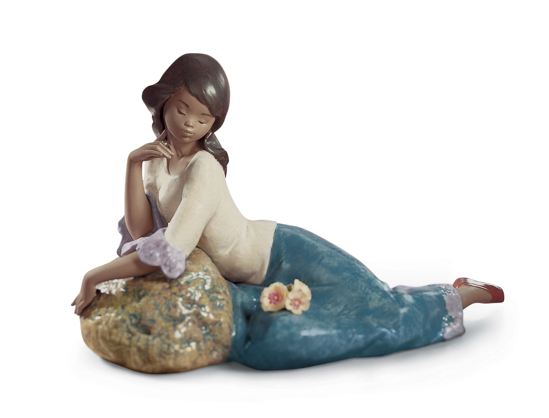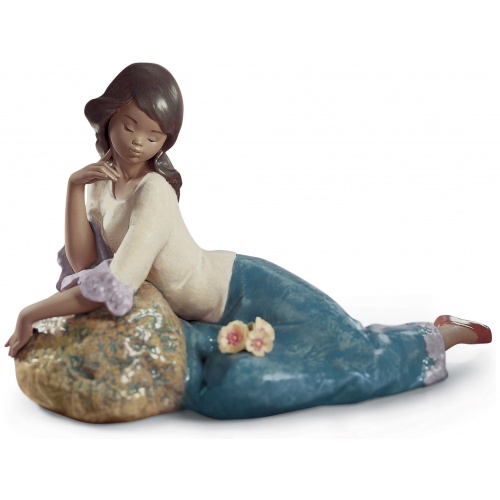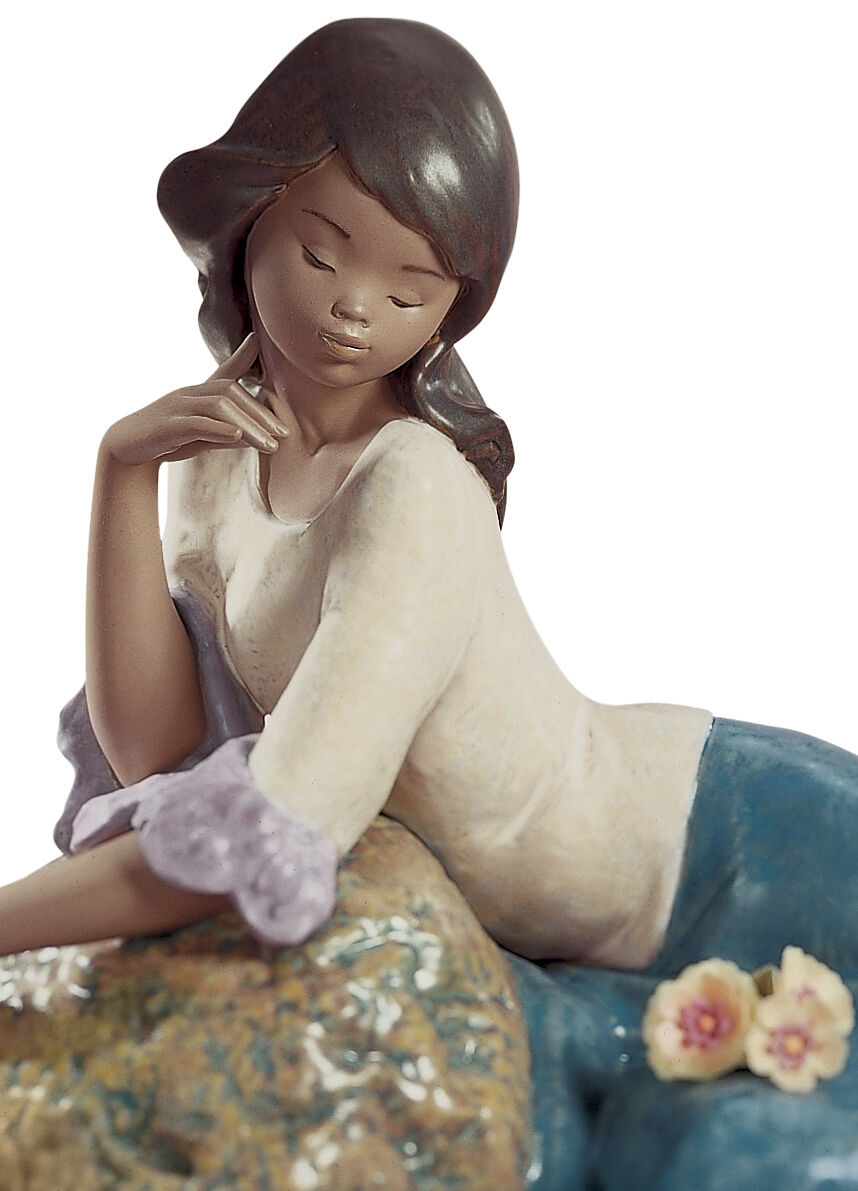 We can only imagine what this young woman resting sweetly may be thinking, as her gaze pauses on some flowers, but her presence conveys peace, tranquillity and calm. A stoneware piece, finished in enamels, perfect as a gift, collectible or decoration.