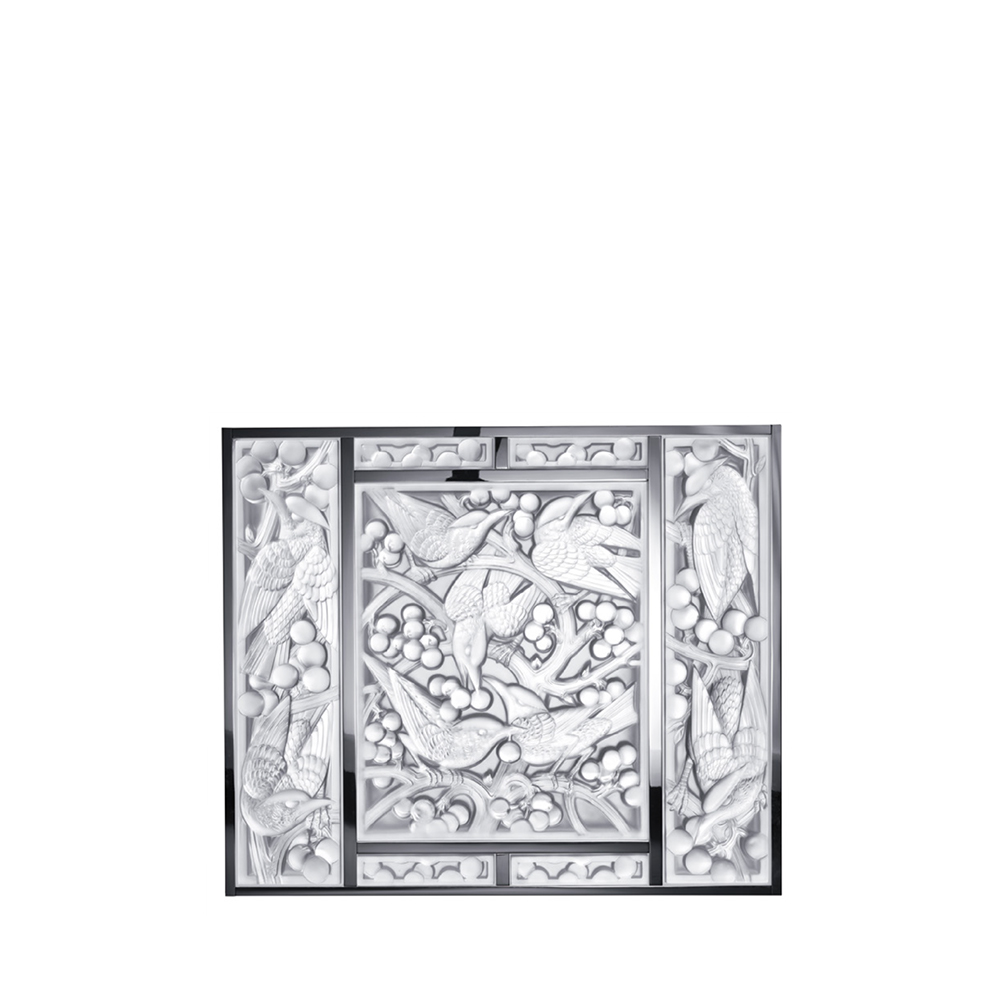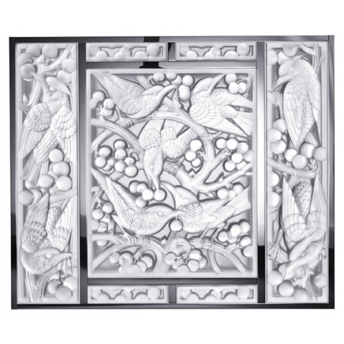 In 1928, René Lalique designed the decorative panels Merles et Raisins in white moulded pressed glass with a silver-coloured background cast white pressed glass on silver background to decorate the Cuban mahogany woodwork of the Presidential Wagon in the famous Orient Express. The pattern Merles et Raisins revives a motif synonymous with elegance and the “Art de Vivre”, depicting a charming design of blackbirds pecking at tiny bunches of grapes. The fineness of the motif, enhanced by the purity of the crystal brings play of light giving life and movement to the piece.