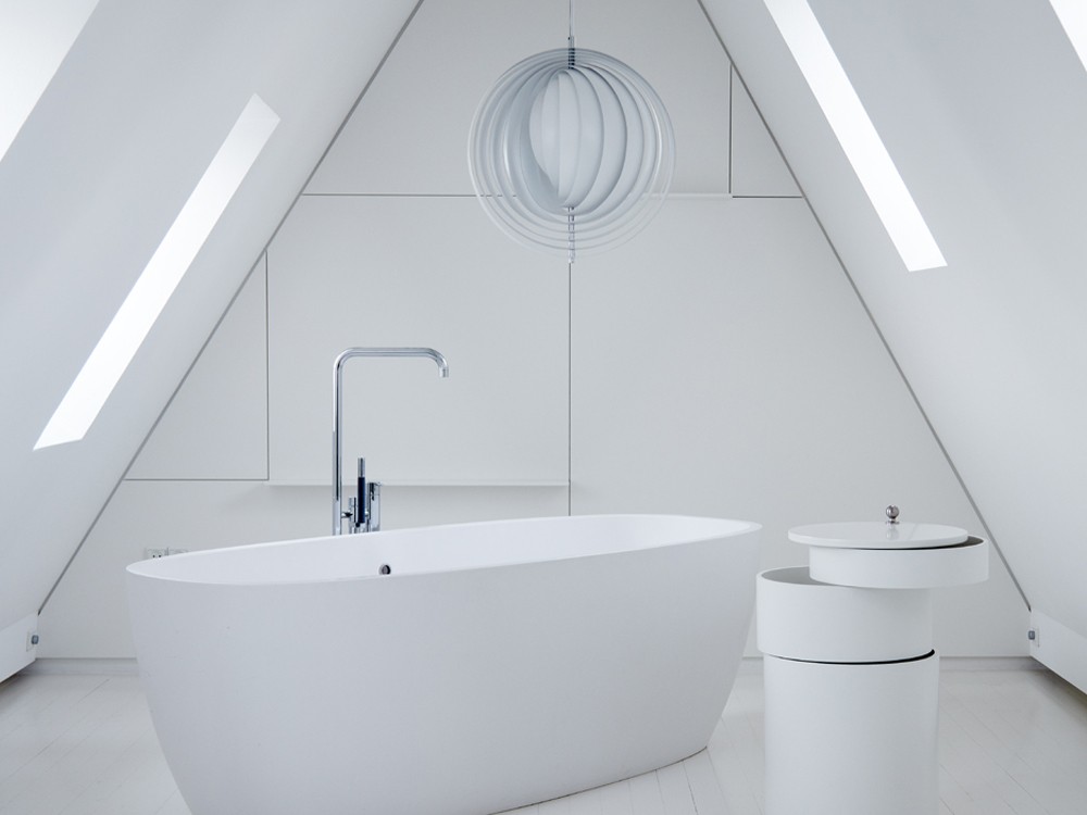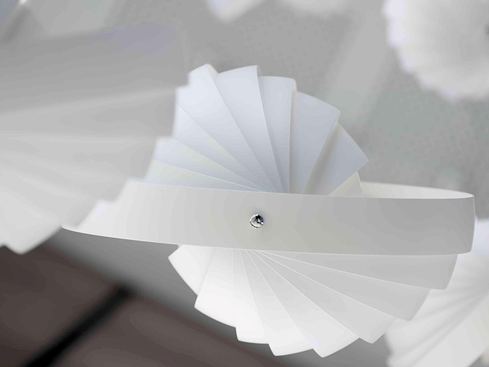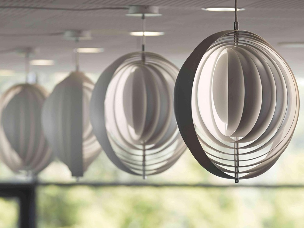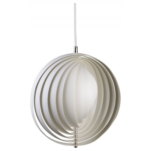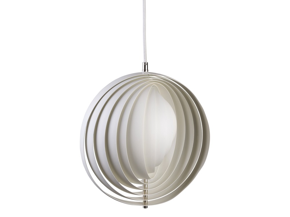 Spherical light crafted by Verner Panton in 1960 featuring a shade of vertical metal lamella in white or orange, arranged like a fan.