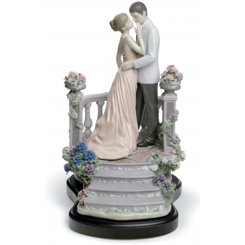 An extraordinary composition with a classic porcelain love scene. A beautiful couple dressed up in an evening dress and white tuxedo, in a classic but current style. Porcelain flowers are everywhere and include hydrangeas and roses of various colours, some as intense as the blue of the stairs. The mosaic of pebbles has been achieved with painted enamels on a surface of engraved porcelain. The classical tone of the scene is relaxed somewhat by the tie, which is comfortably undone. It makes an unforgettable gift for occasions such as weddings and engagements.