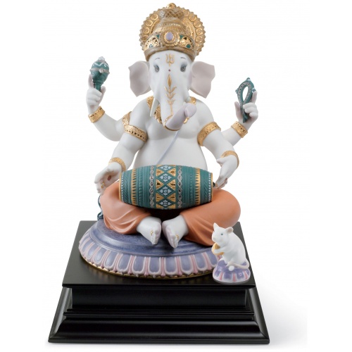 Lord Ganesha is the god of wisdom and knowledge. This deity is very popular in India, and he is represented here playing a mridangam, a traditional instrument. In addition, the piece portrays other attributes of the traditional iconography of Ganesha, such as the gada (mace), the Paasha (rope) and the broken fang, all elements whose symbolism is contained in the avatars, or traditional stories about Ganesha, which are known well by his numerous worshippers.
