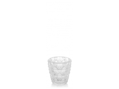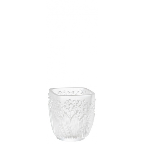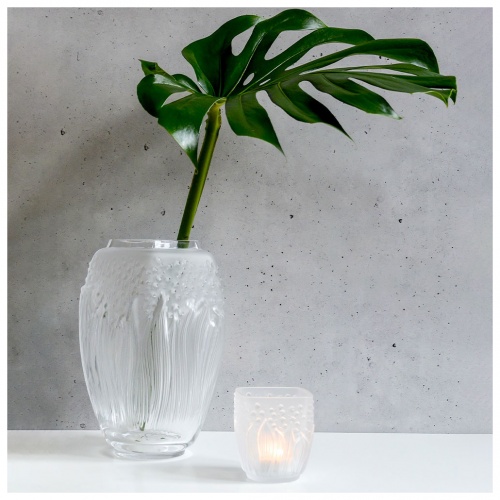 A symbol of good luck and René Lalique’s favourite flower, lily of the valley plays on accumulation on this vase and votive. The light and delicate bells are revealed behind the long undulating leaves, as if rocked by the wind. The square shape contrasts with the curved lines of the motifs illuminated by satin-finished crystal.