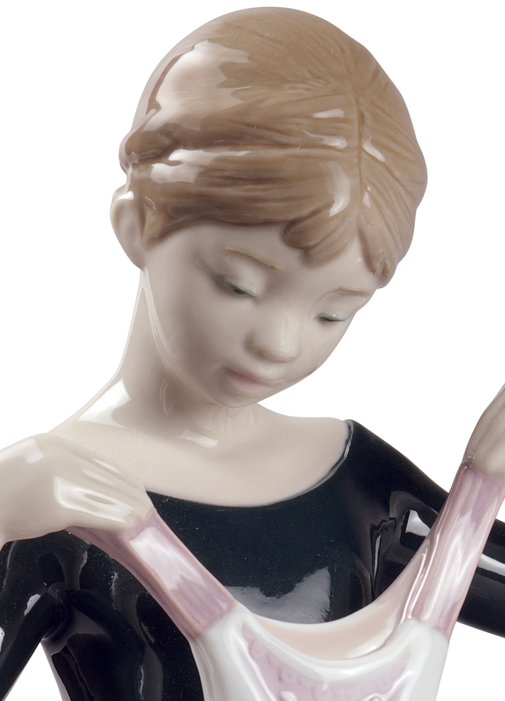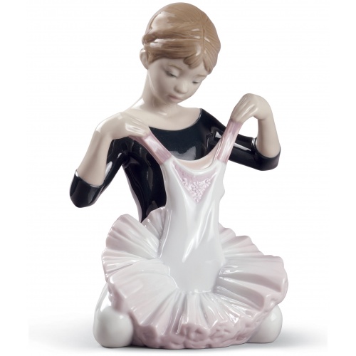 She is eager to make her debut. At last, she can perform in front of family and friends and show off her lovely new dress. A glossy porcelain piece decorated in soft pastel colours, ideal as a gift to a lover of ballet.