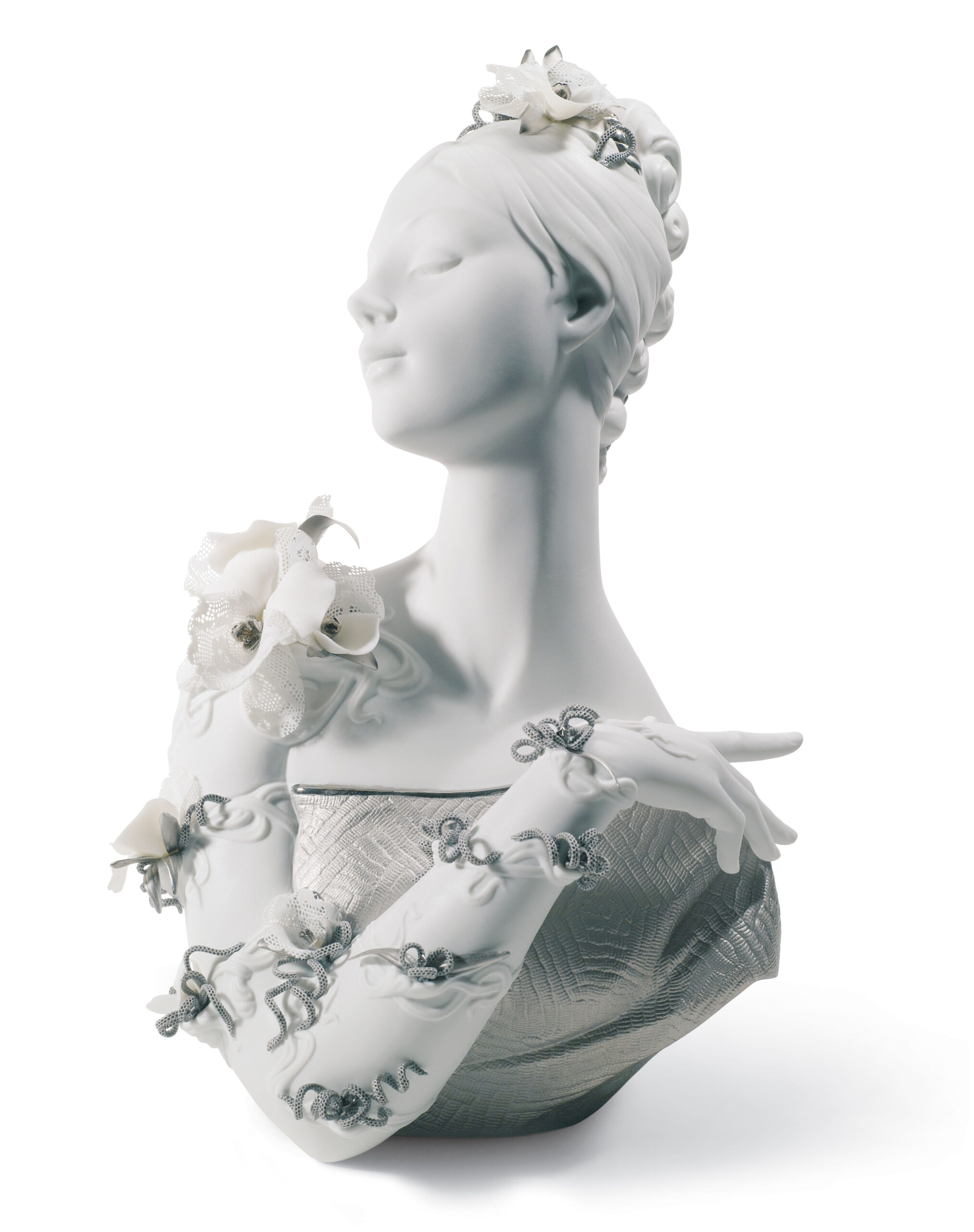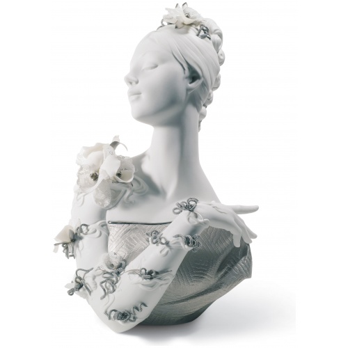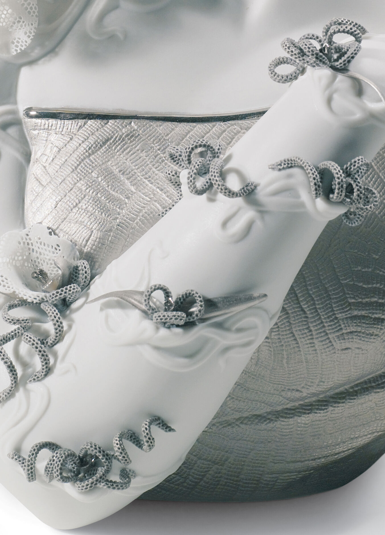 The Re-Deco concept gives a new life to the classic pieces of the LladrĂ³ catalogue through a new and striking decorative approach. This refined lady takes on a much more contemporary style, thanks to the contrast between the matte white porcelain finish and the silver lustre that lifts the embroidery of the beautiful dress and other details of the piece.