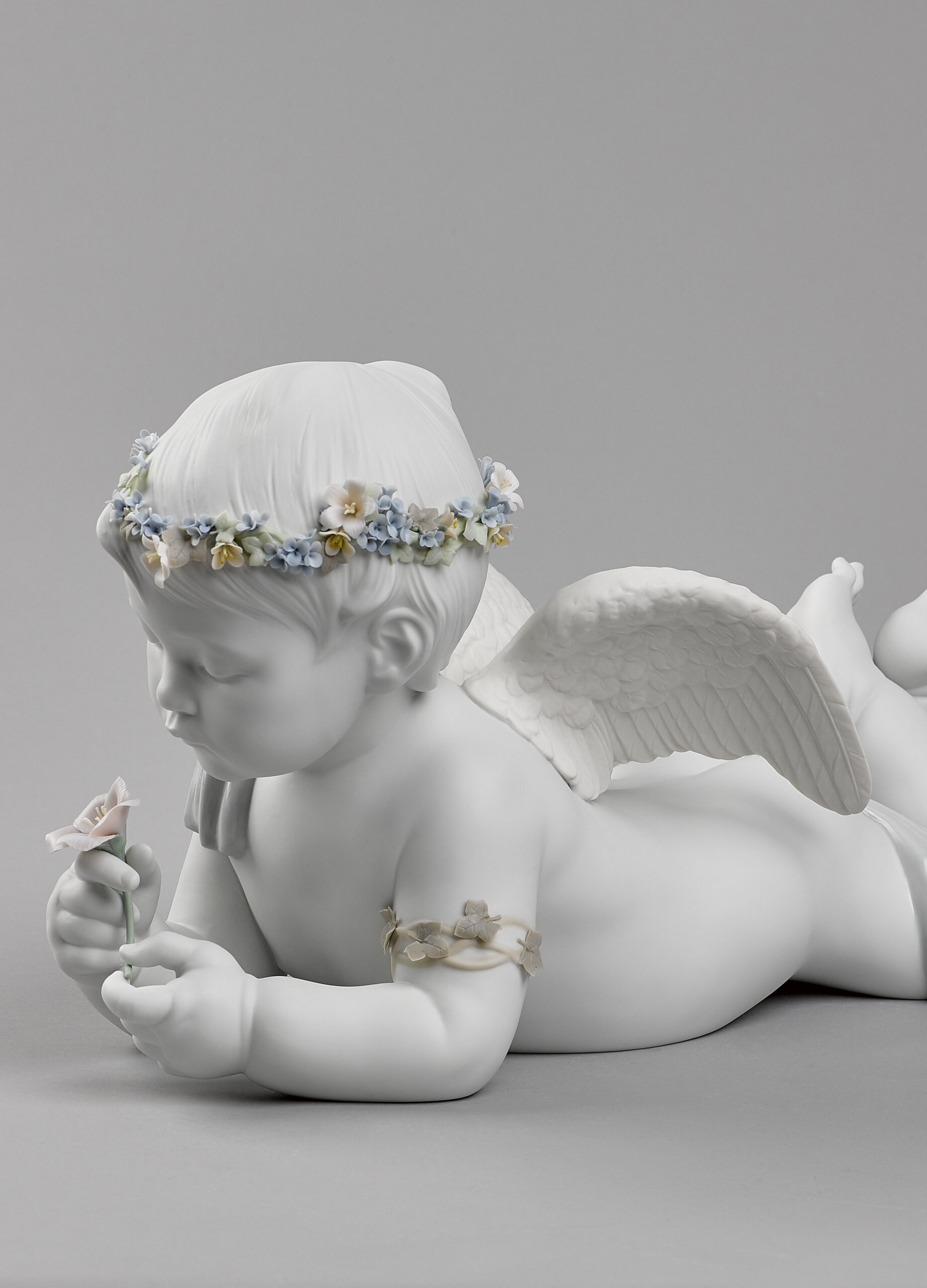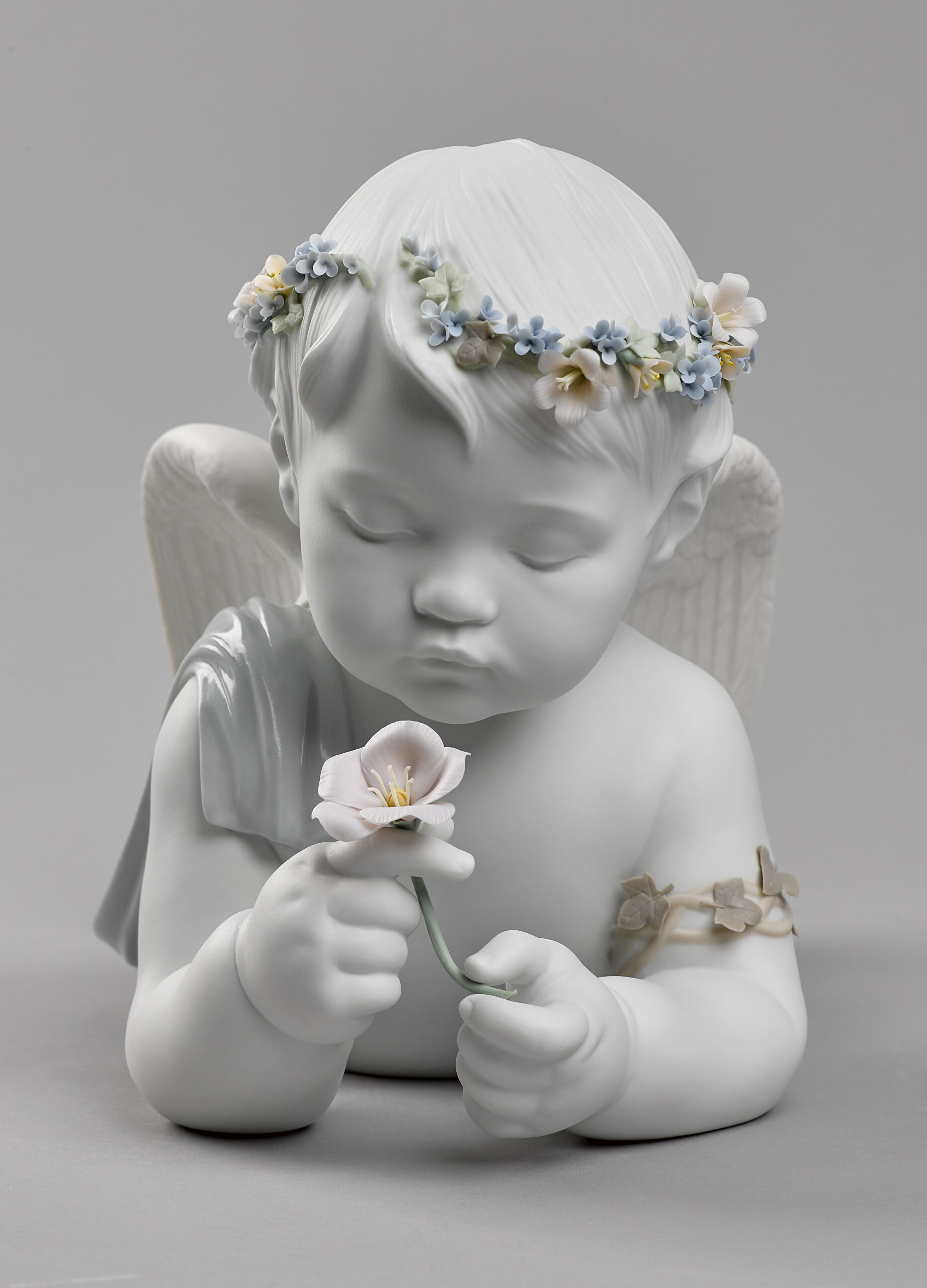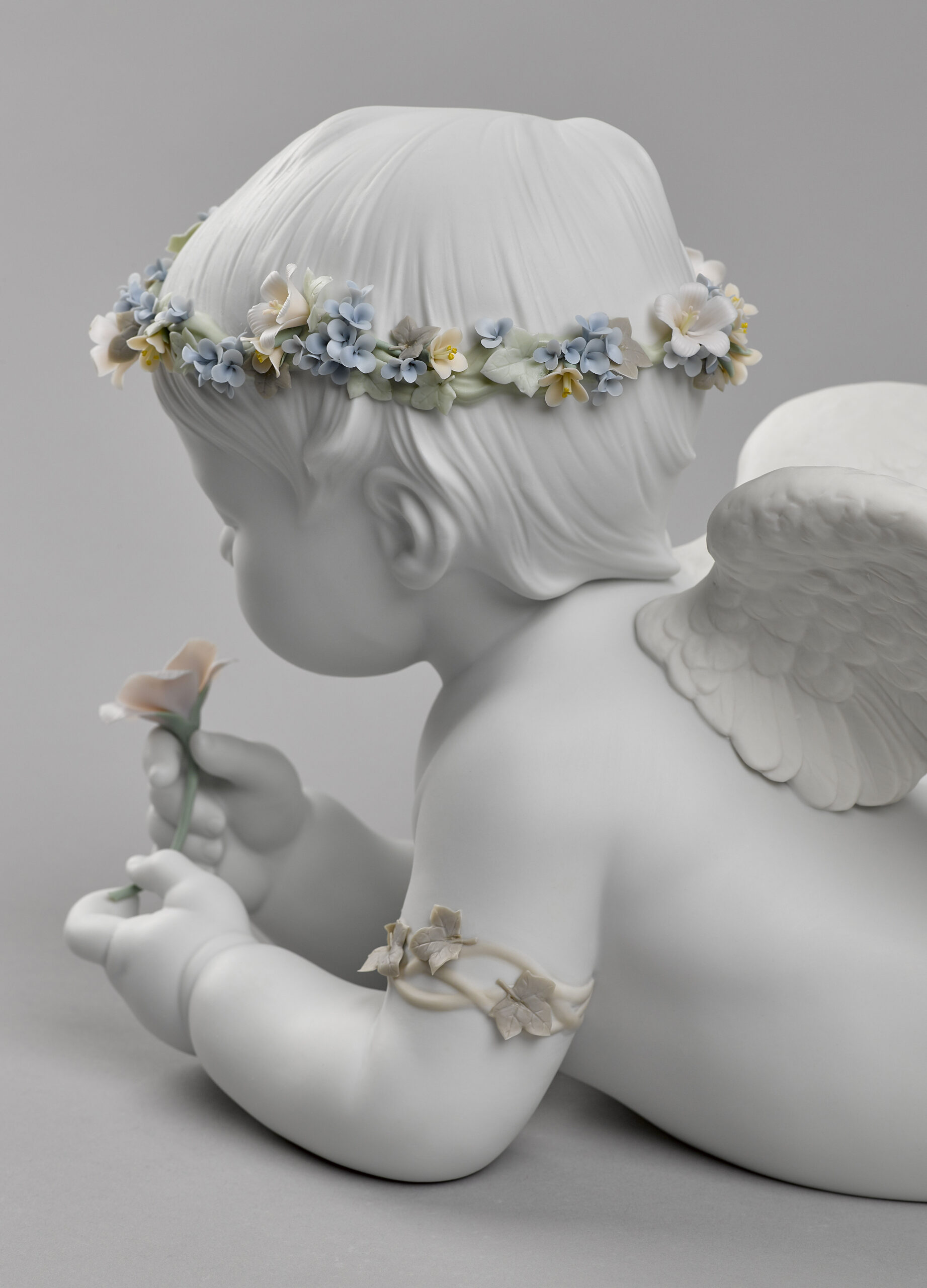 An angelic creature, realistic and yet at the same time idealised, as earthly as it is heavenly. A matte porcelain piece decorated in soft pastel colours, which stands out for its exquisite modelling and for its flowers, carefully crafted petal by petal.