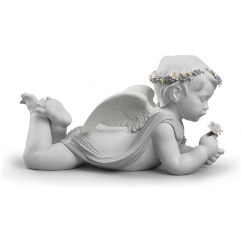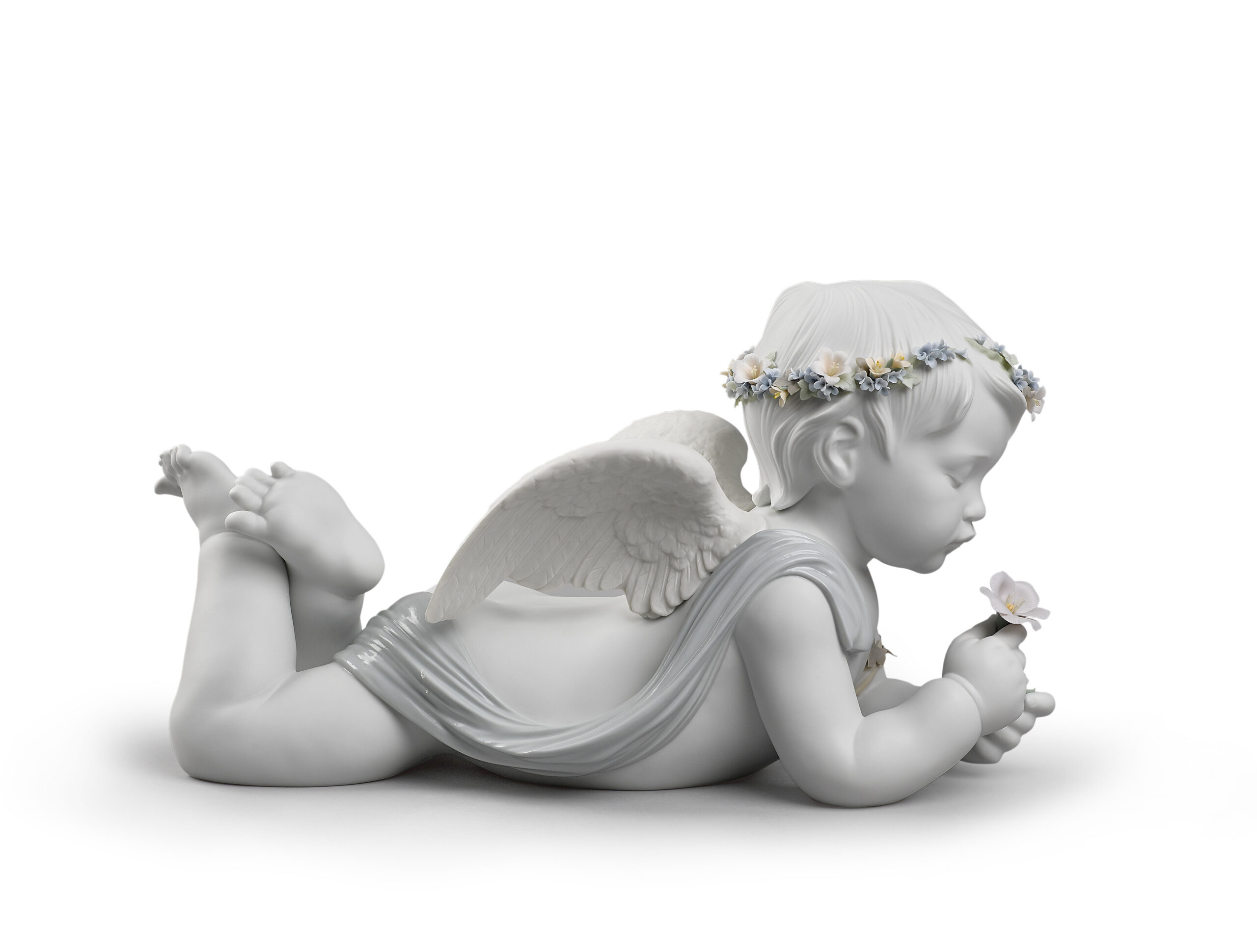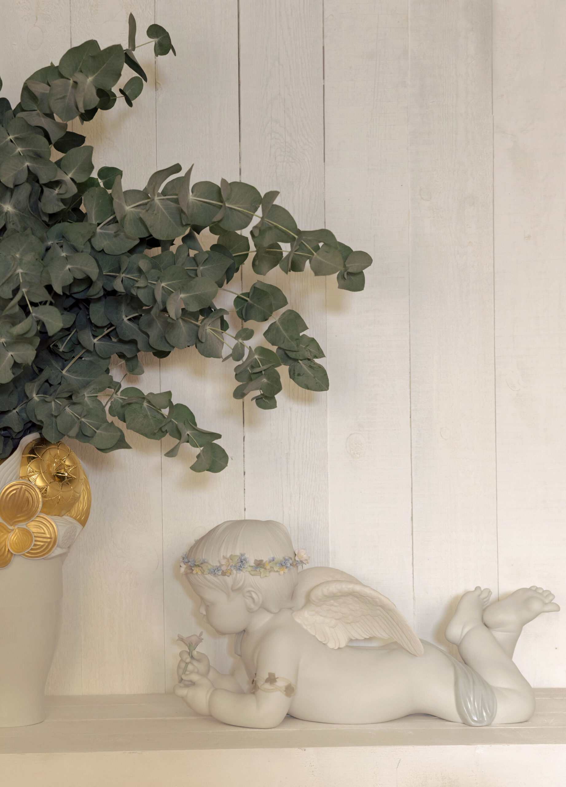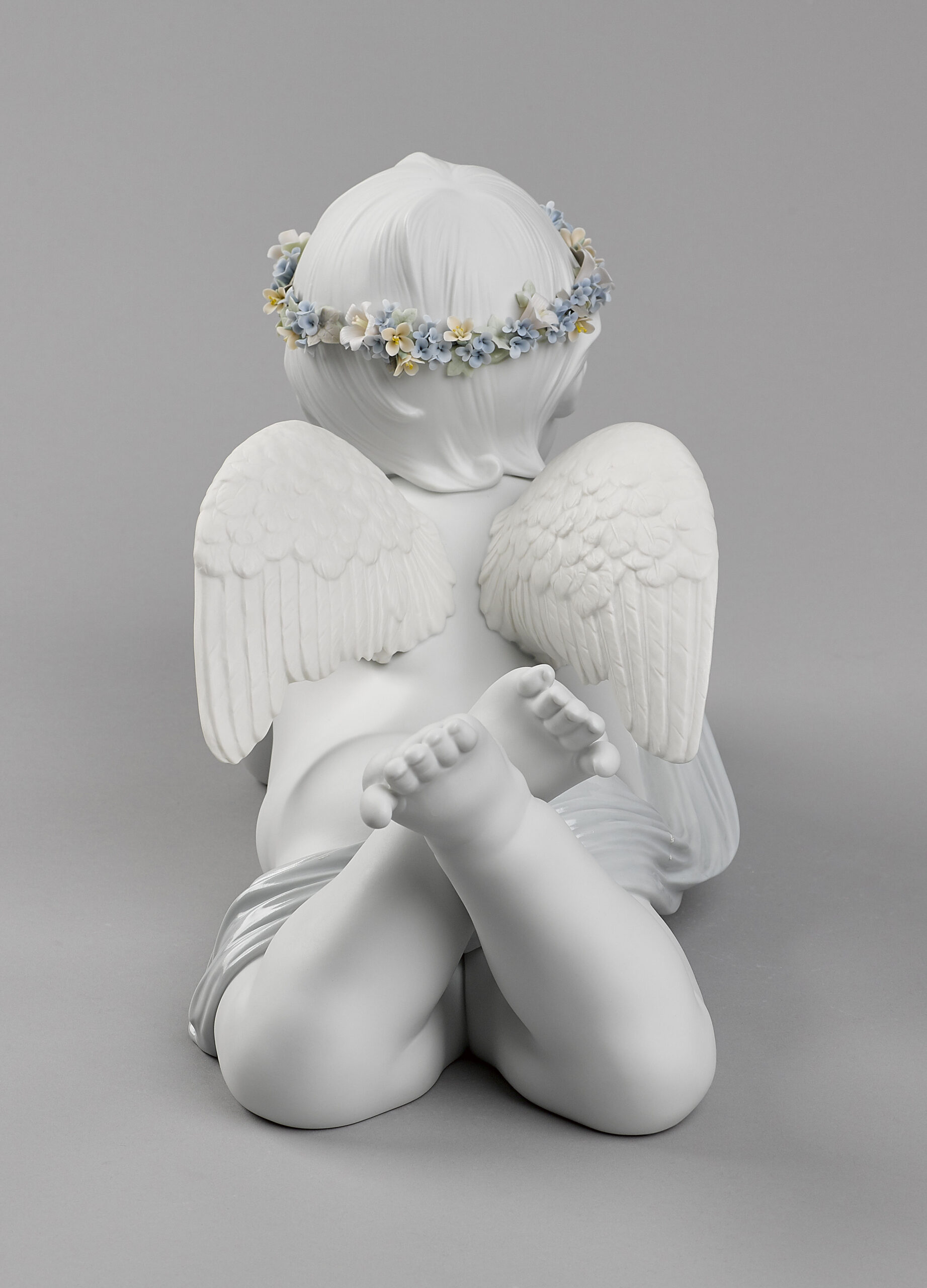 An angelic creature, realistic and yet at the same time idealised, as earthly as it is heavenly. A matte porcelain piece decorated in soft pastel colours, which stands out for its exquisite modelling and for its flowers, carefully crafted petal by petal.