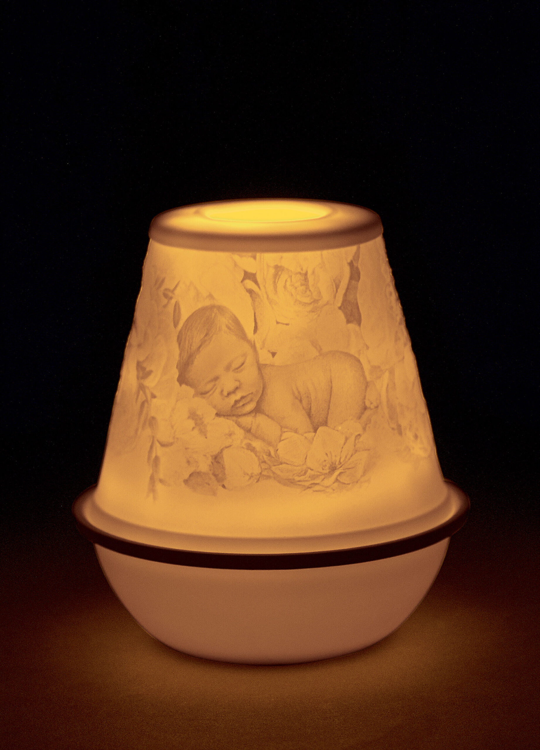 The New Baby Lithophany votive depicts motifs in precisely defined engravings and relief sculpture in translucent porcelain, inspired by the joy of welcoming a new member of the family. This lithophany can be acquired as a standard product, or can be personalized with the names of the baby for an additional fee. If you prefer this option, please contact our Customer Services department, who will explain the process and the exact cost of personalization.