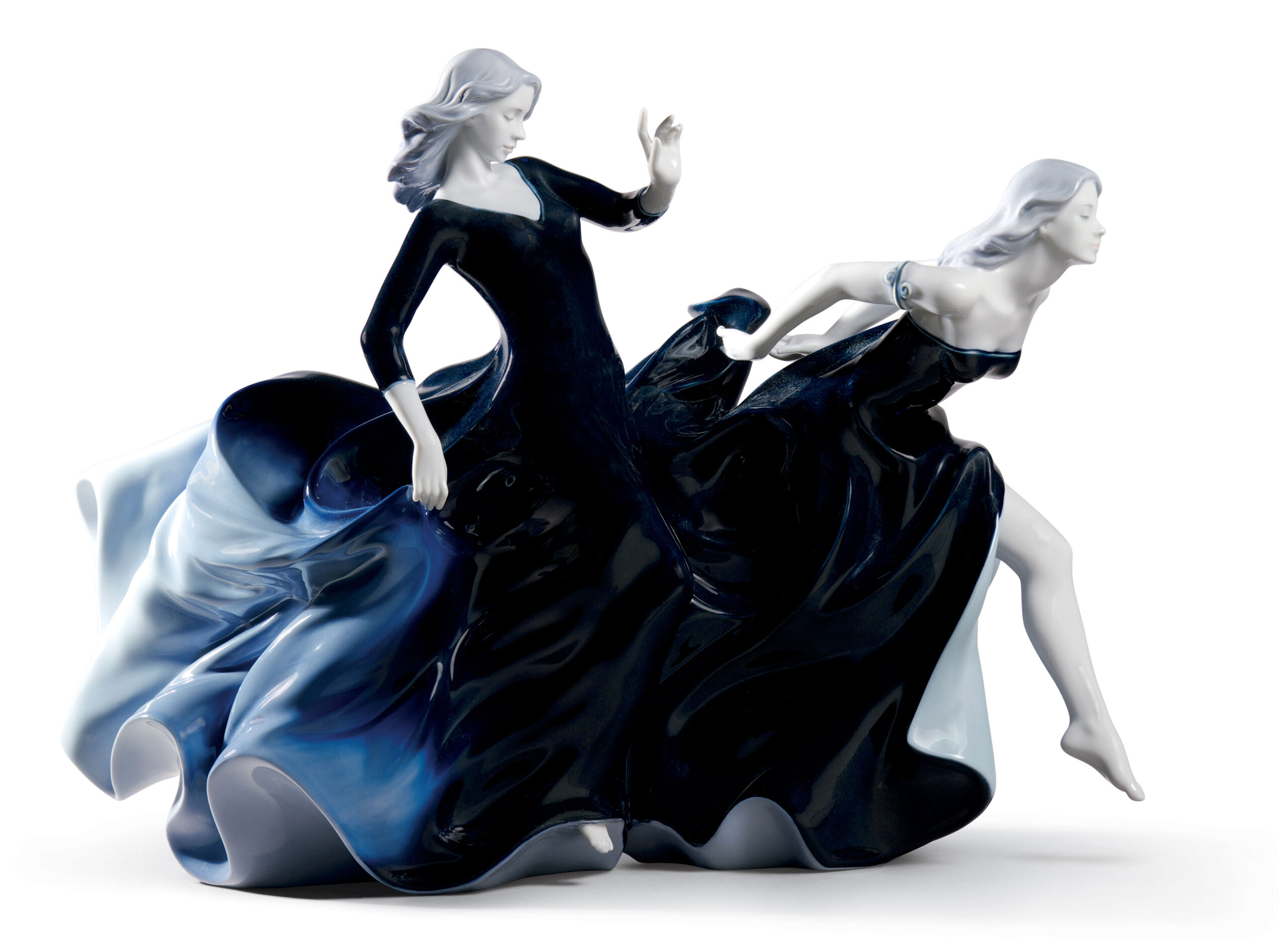 Two beautiful young women hurry to get out into the night. Their long dresses, which give away their destination, undulate voluptuously as they run. As they move they turn a more intense blue, almost black.