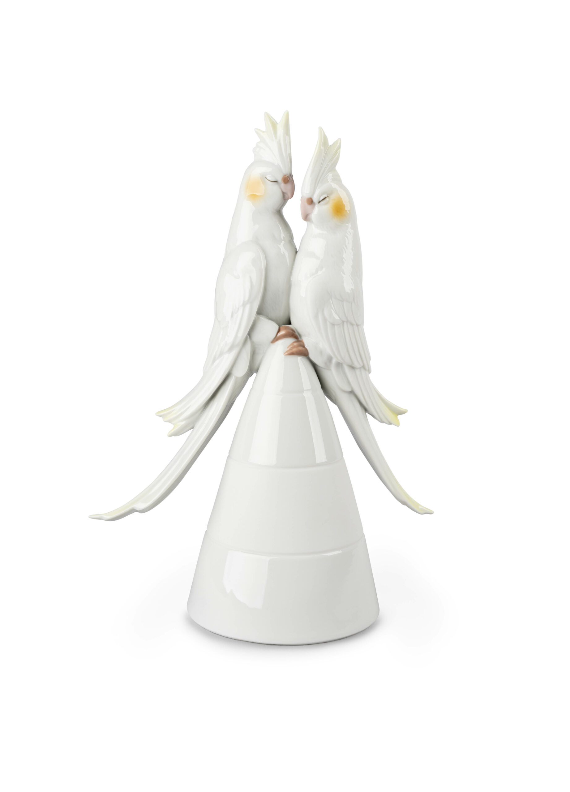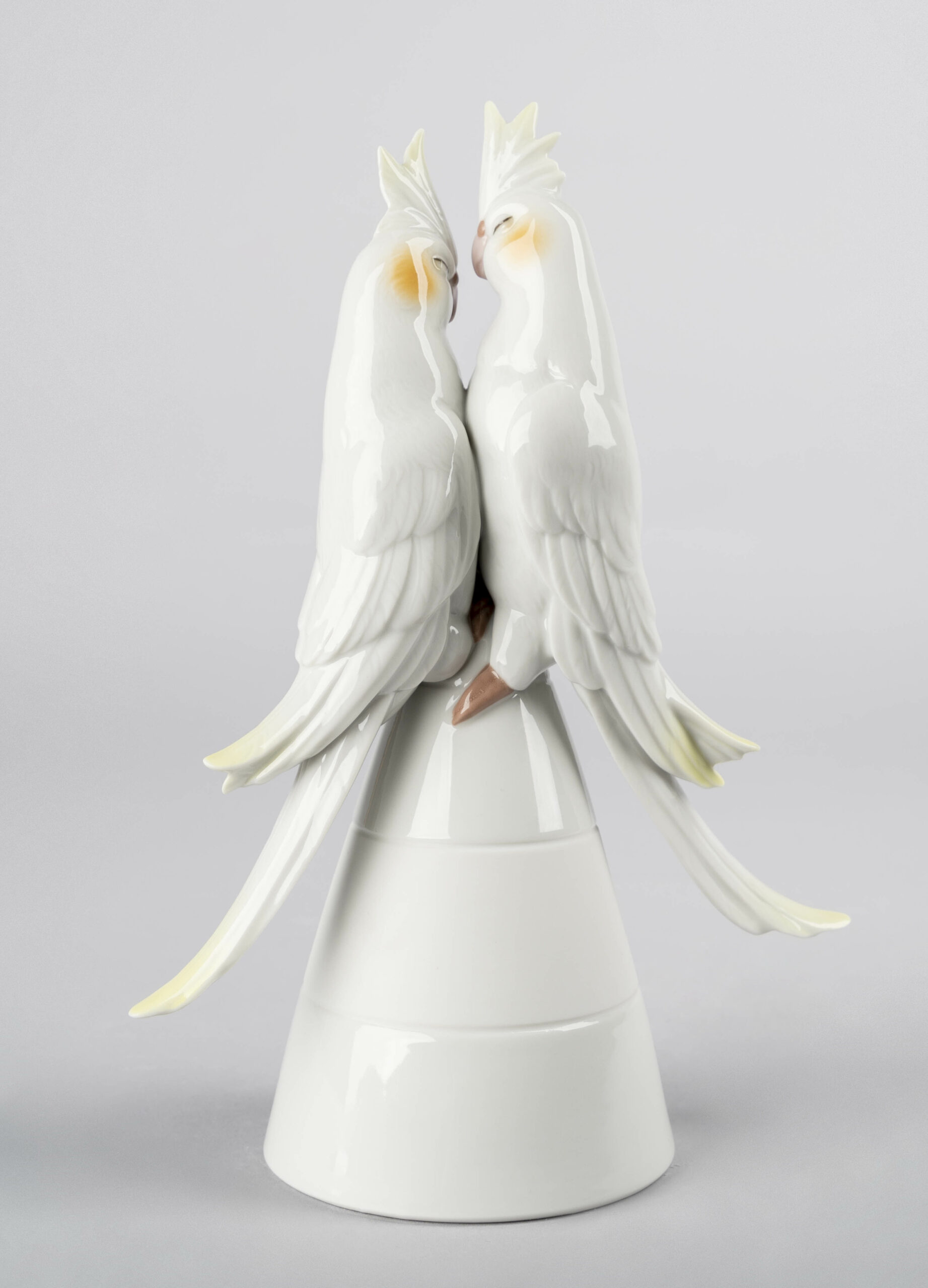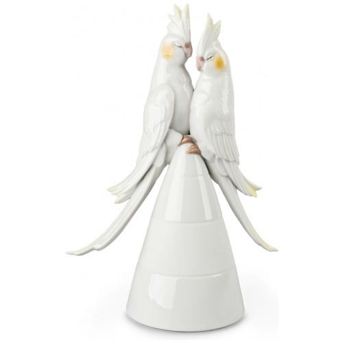 The two cute birds are depicted in heightened detail in glazed and matte white porcelain, decorated with subtle notes of pastel colors. The piece was conceived as a romantic gift or even as a topper for a wedding cake as a more original and modern alternative to the conventional bride and groom. Handcrafted in the Lladró workshops in Spain.