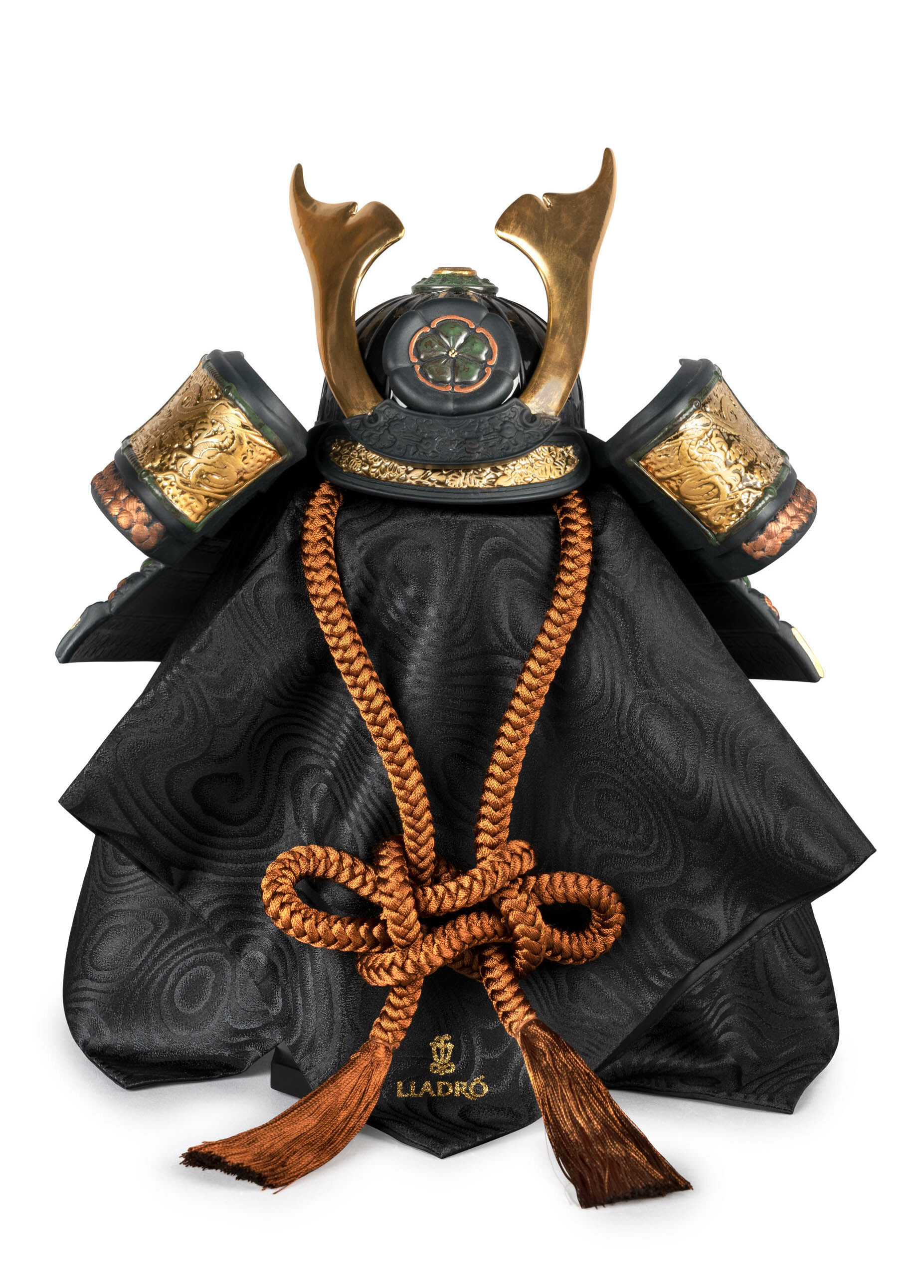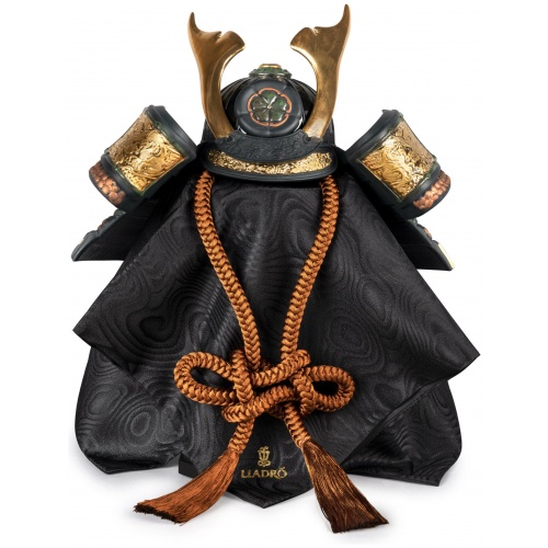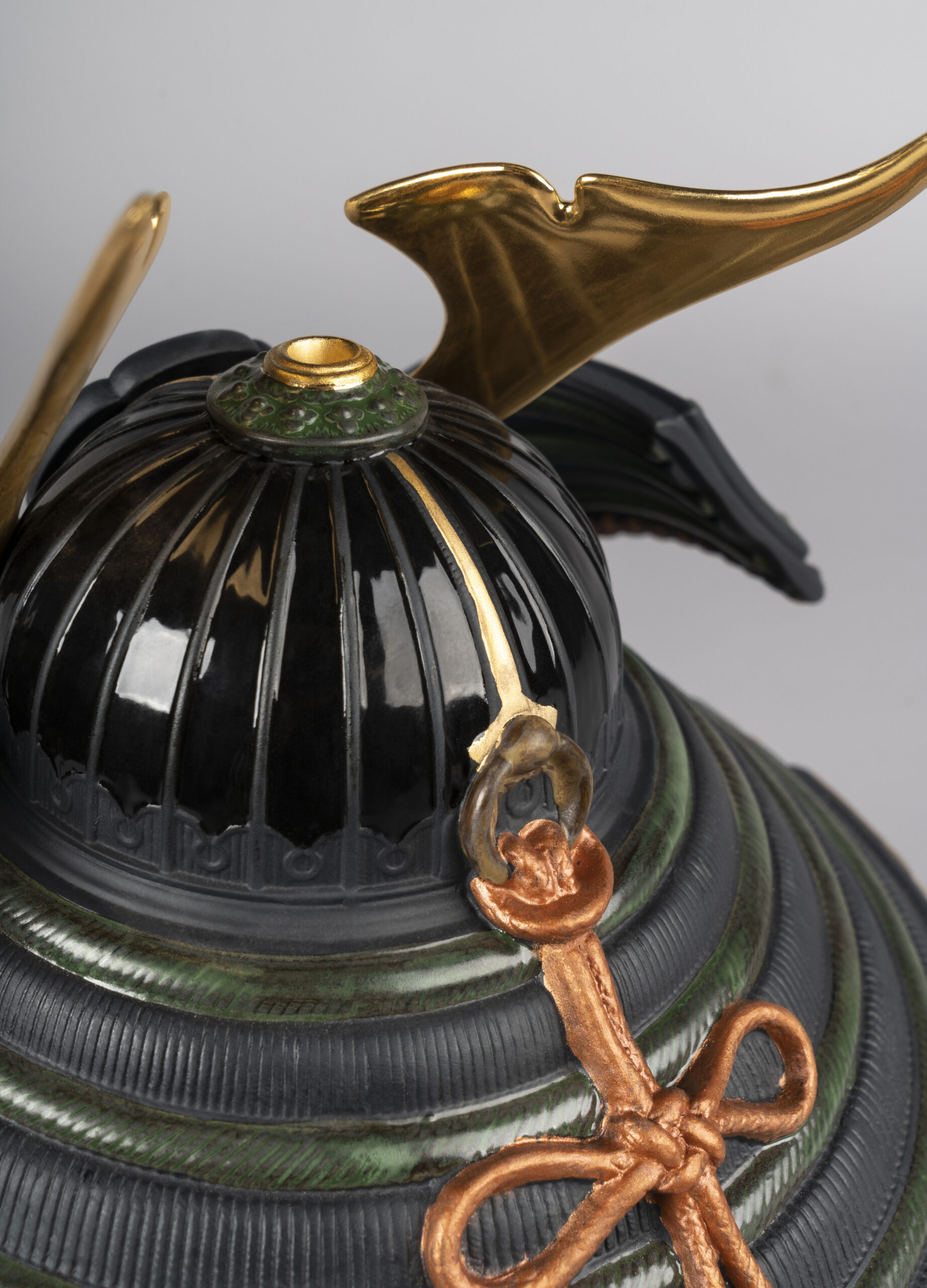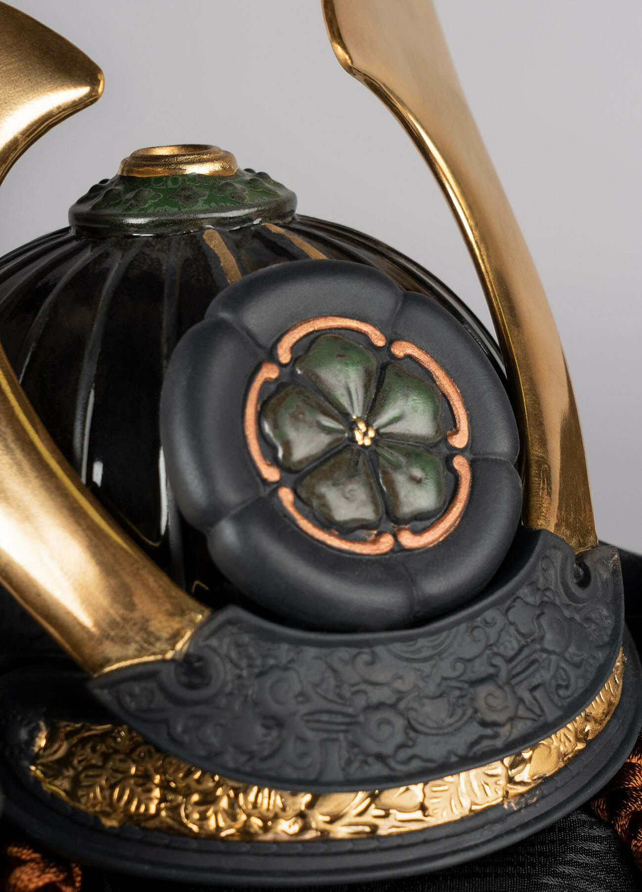 Piece inspired by the helmets of ancient samurais, one of the most characteristic elements of the uniforms of these mythical warriors. Made in black matte porcelain with golden luster and richly decorated with exquisite ornamentation work, this creation is a tribute to traditional Japanese culture.