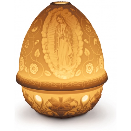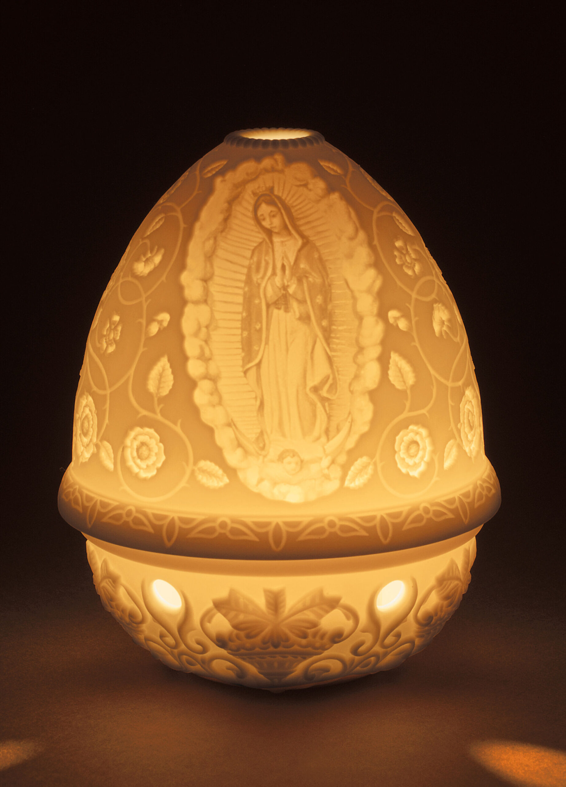 The magic of lithophany is born from the play of light with the translucent character of porcelain. By illuminating its interior, it projects warm lighting throughout the room and highlights the engraving that decorates it, producing surprising relief effects on its surface. This piece represents Our Lady of Guadalupe, the Queen of Mexico, one of the most beloved virgins in the world and the one who awakens most devotion in the North American country.