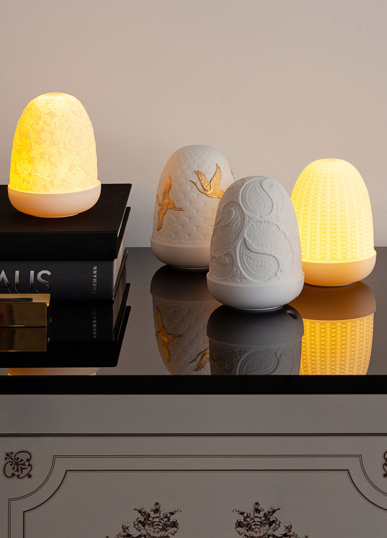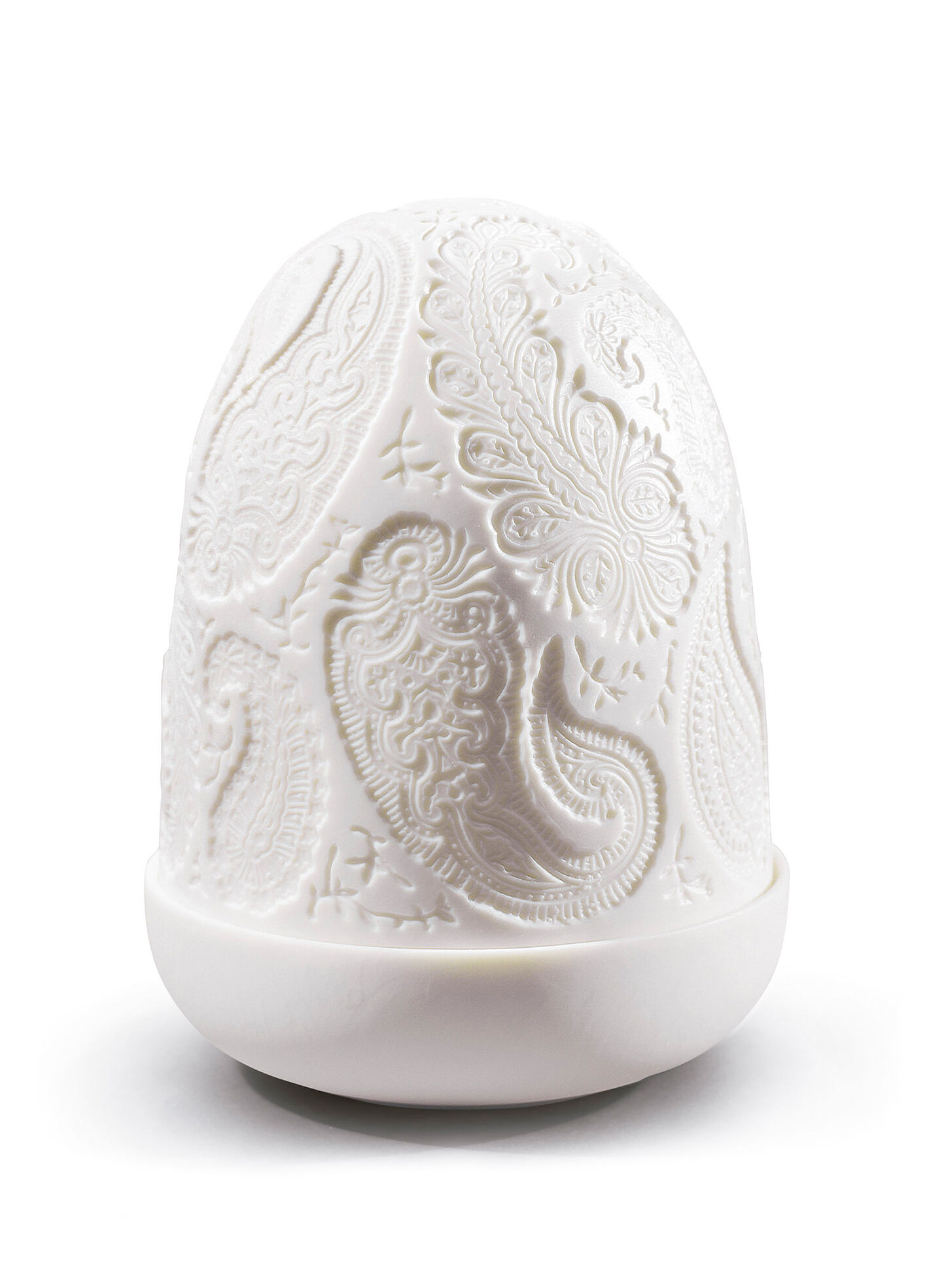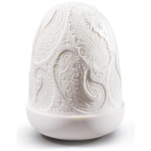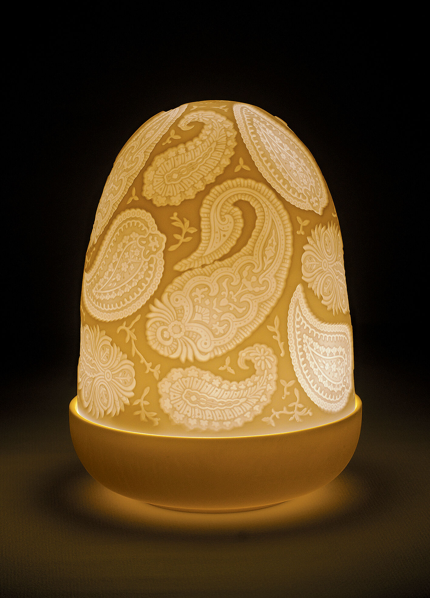 Paisley Dome lamp is a new line of lamps based on the technique of lithophanies. When turned on, the light projects the motifs emitting a warm and suggestive glow that invites to calm, to relaxation with a welcoming effect. Inspired by a curved teardrop design.
