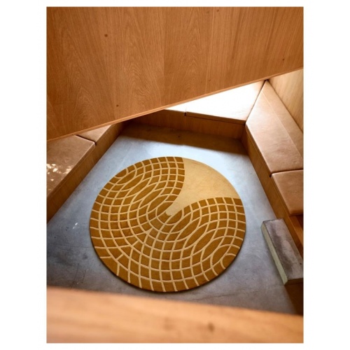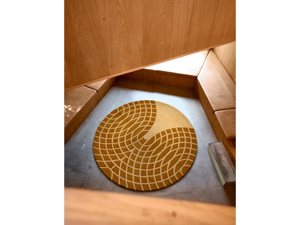 Two coloured rug with geometric circle pattern.