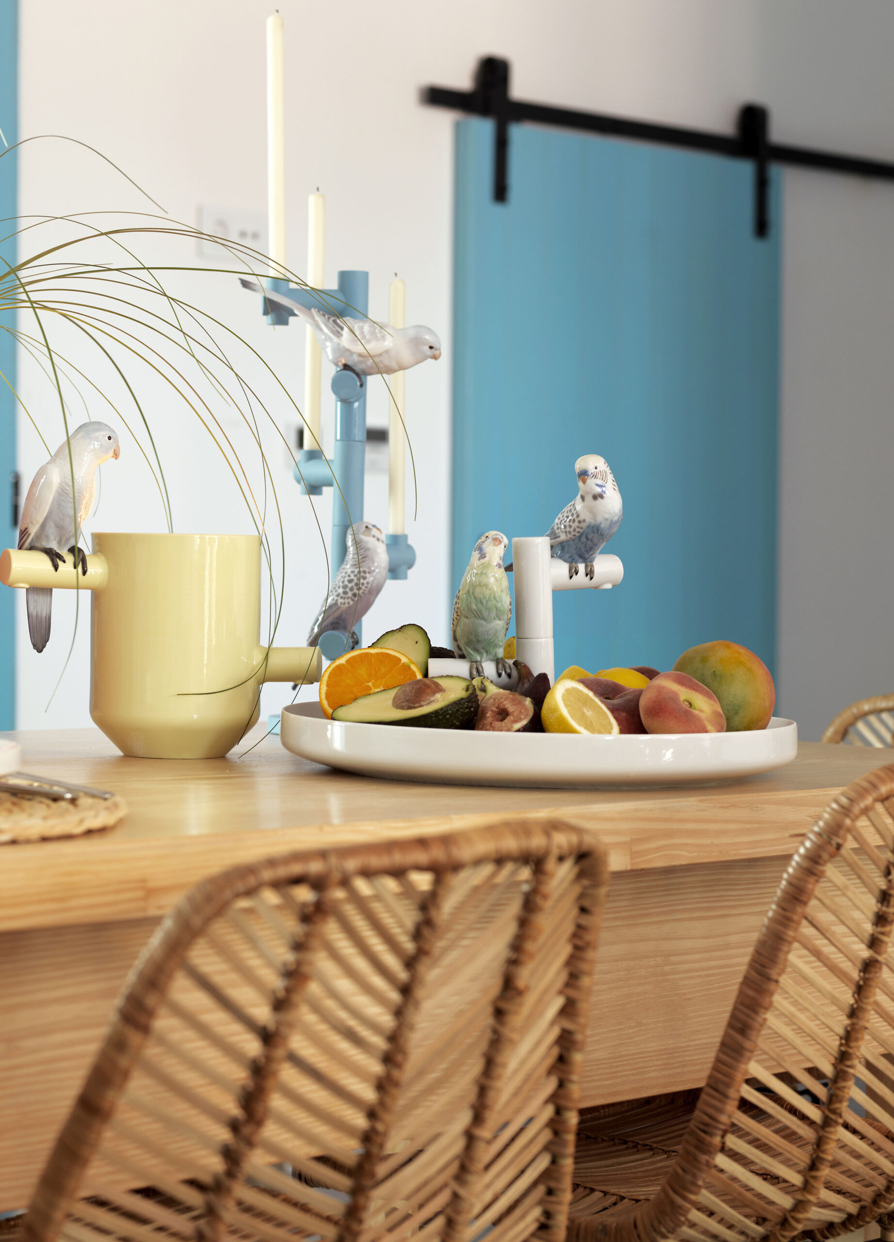 Mirror from the Parrot Party collection, based on the contrast between the refined geometric design of the objects’ functional forms and the meticulously realistic representation of the graceful birds that decorate them. The plumage of the various species has been recreated to the smallest detail in birds that seem to come to life, brightening pieces that are both useful and beautiful, and ideal for every kind of setting.
