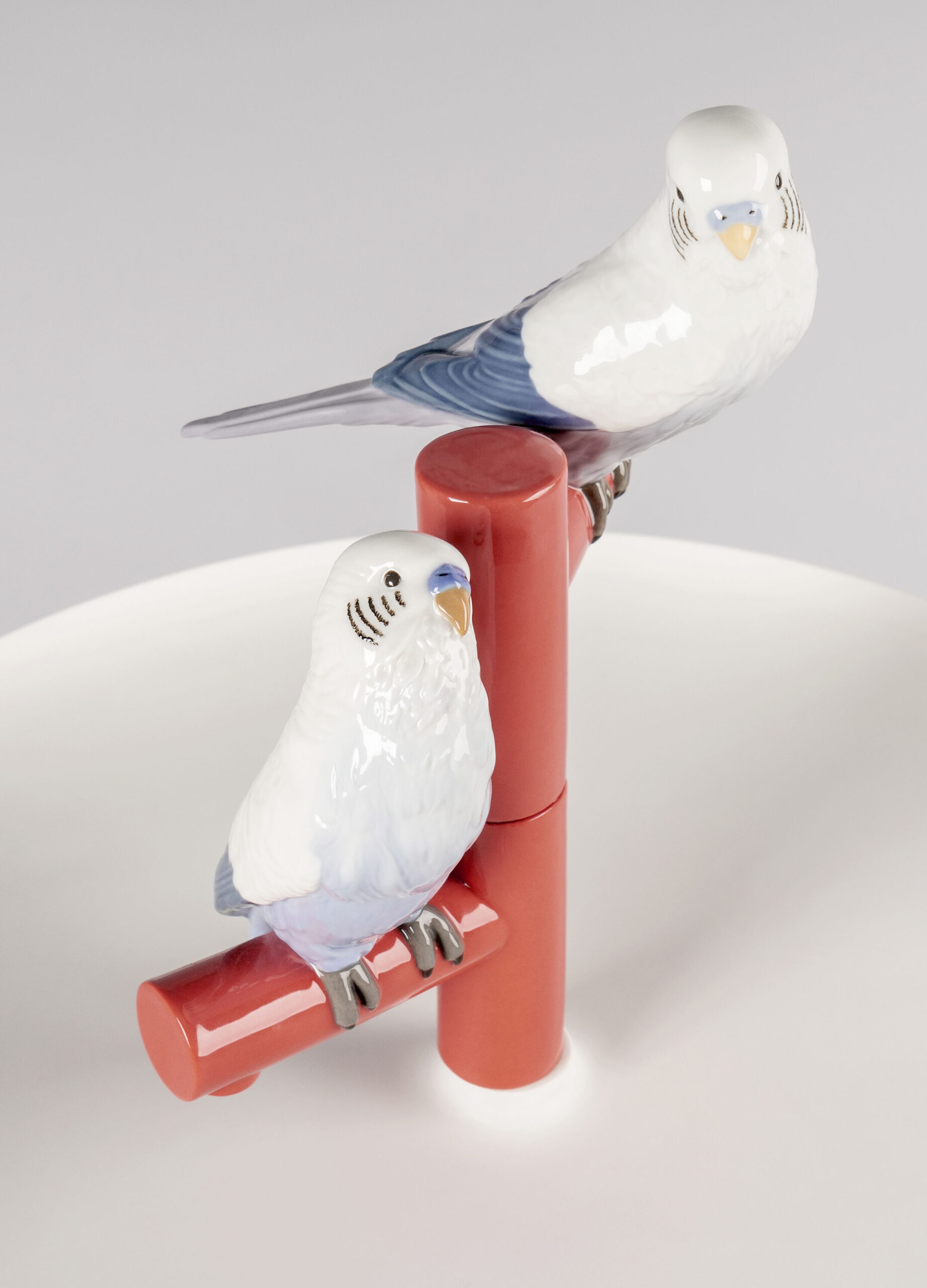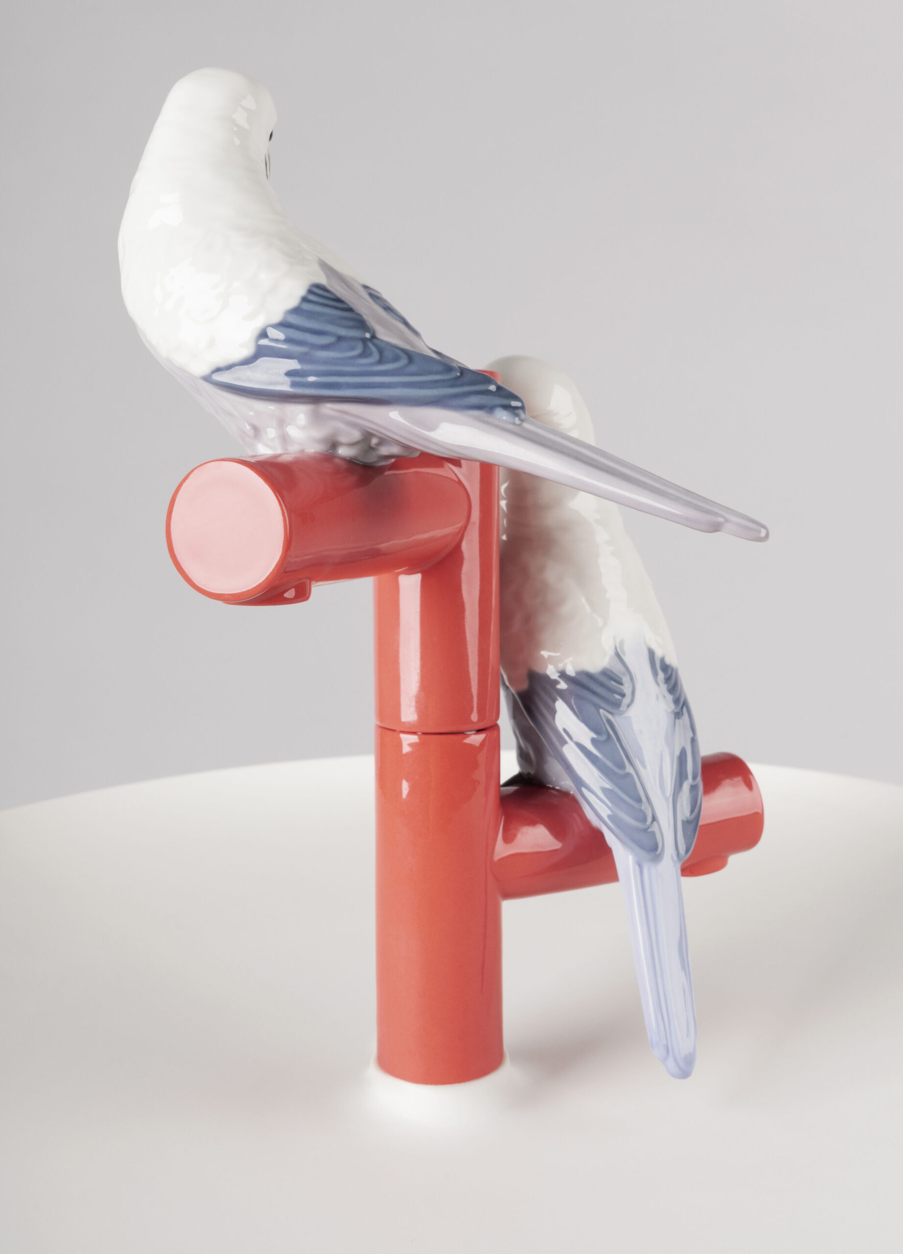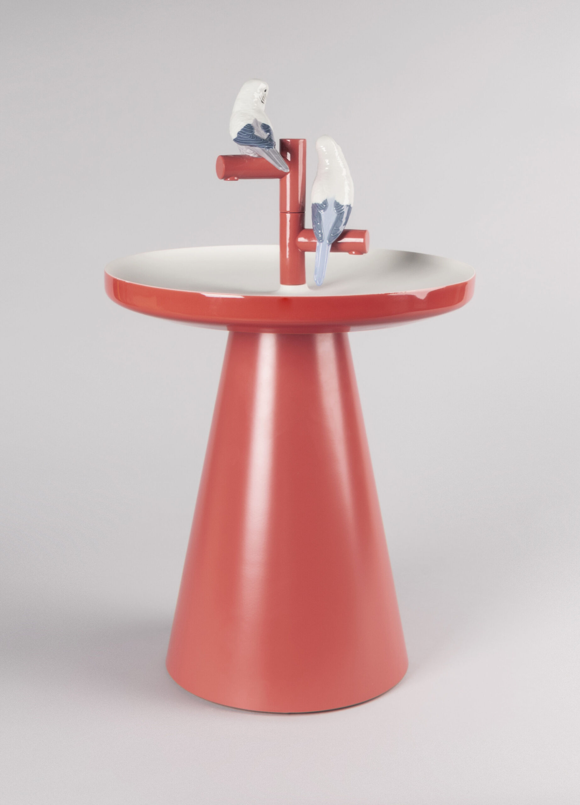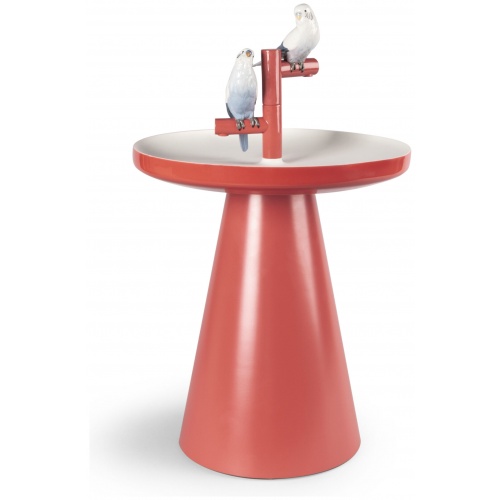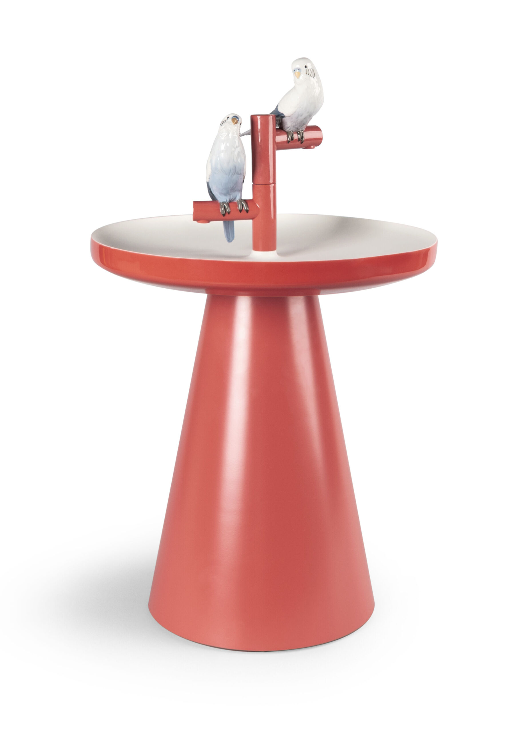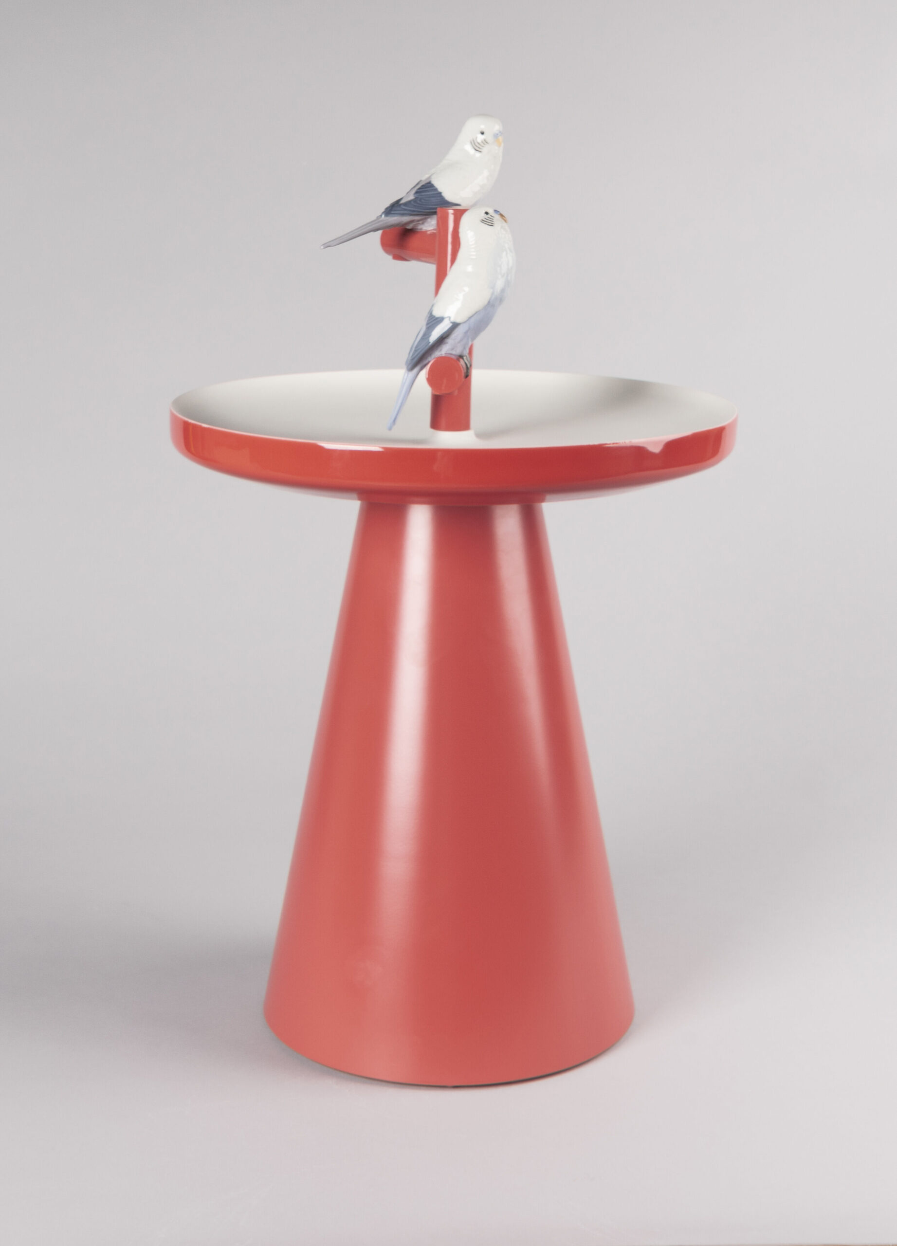 Made in a combination of porcelain for the table top and wood for the base, decorated in an intense coral color. The plumage of the parakeet has been reproduced down to the tiniest detail, making them seem to almost come to life, animating a piece that is both functional and beautiful, ideal for all kinds of interiors. Handcrafted in Spain.