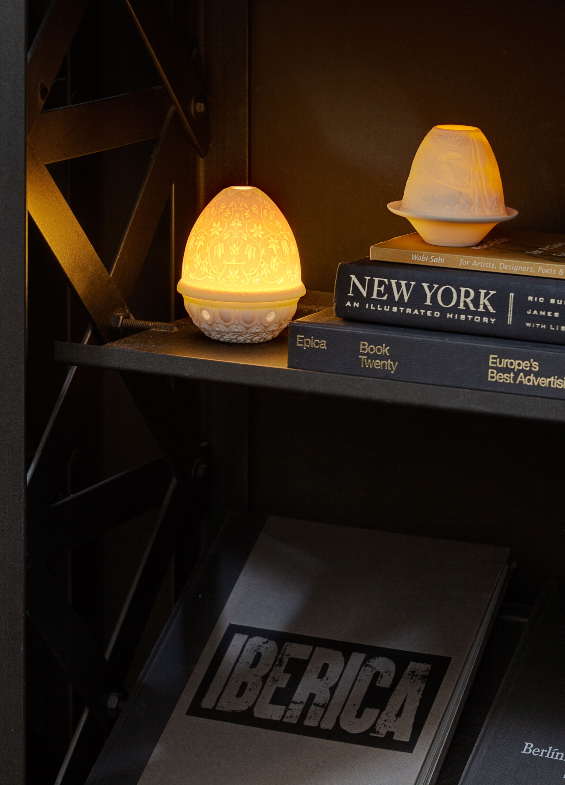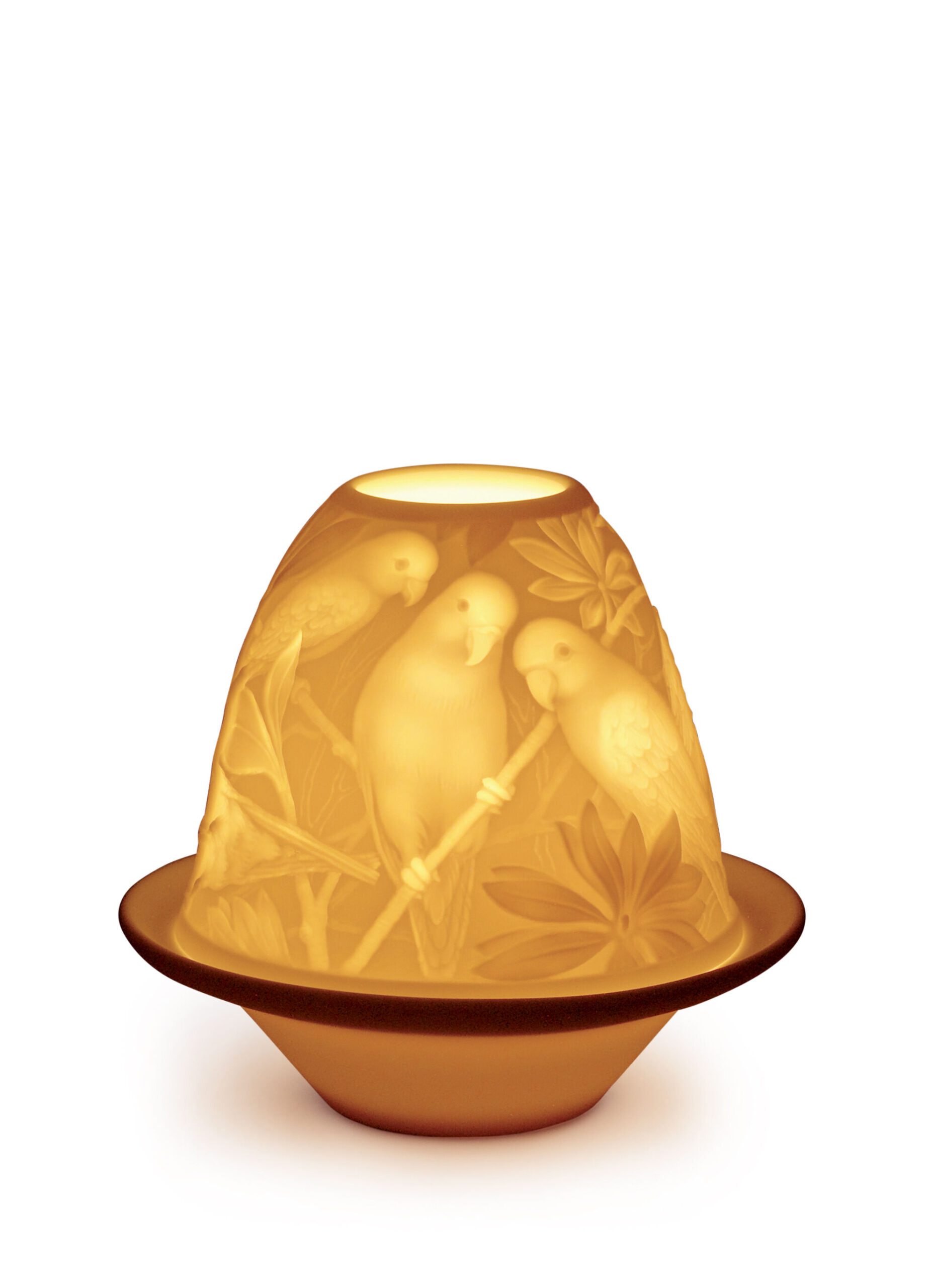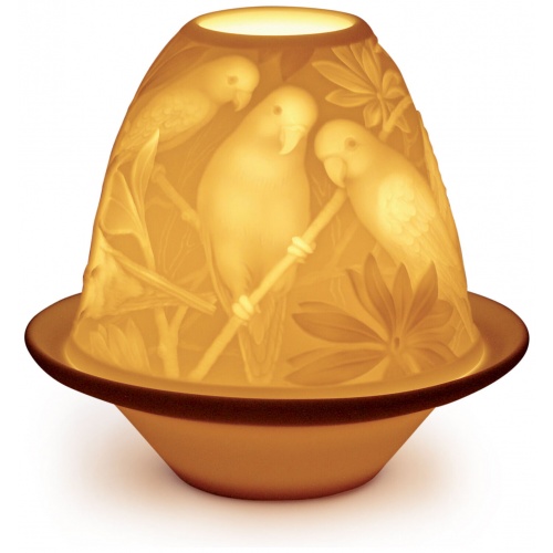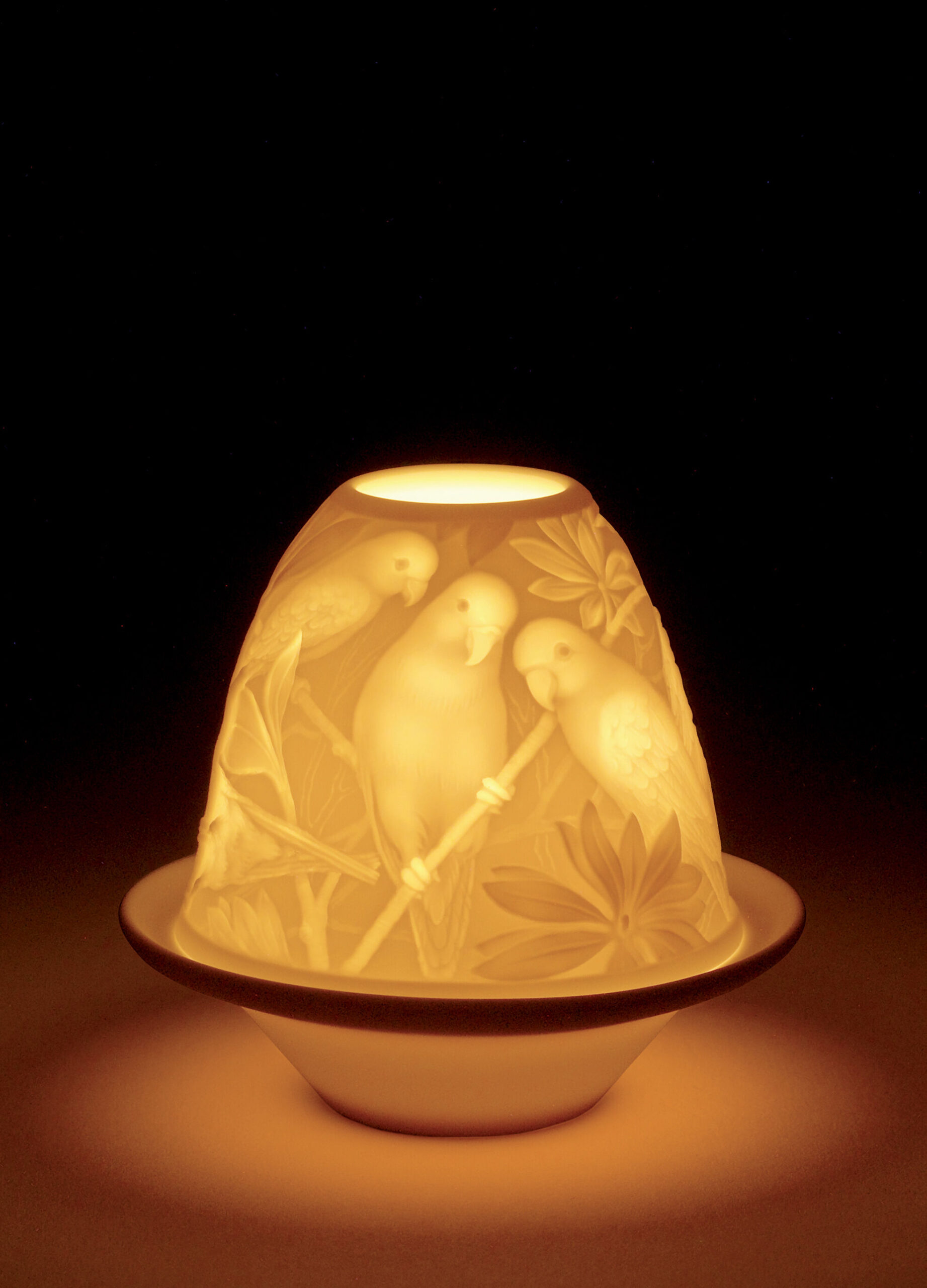 The magic of lithophany is born from the play of light with the translucent character of porcelain. By illuminating its interior, it projects warm lighting throughout the room and highlights the engraving that decorates it, producing surprising relief effects on its surface. This piece shows us a beautiful natural scene starring some nice parrots surrounded by vegetation. Perfect for gifts and for animal lovers.