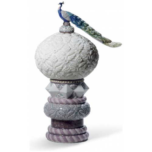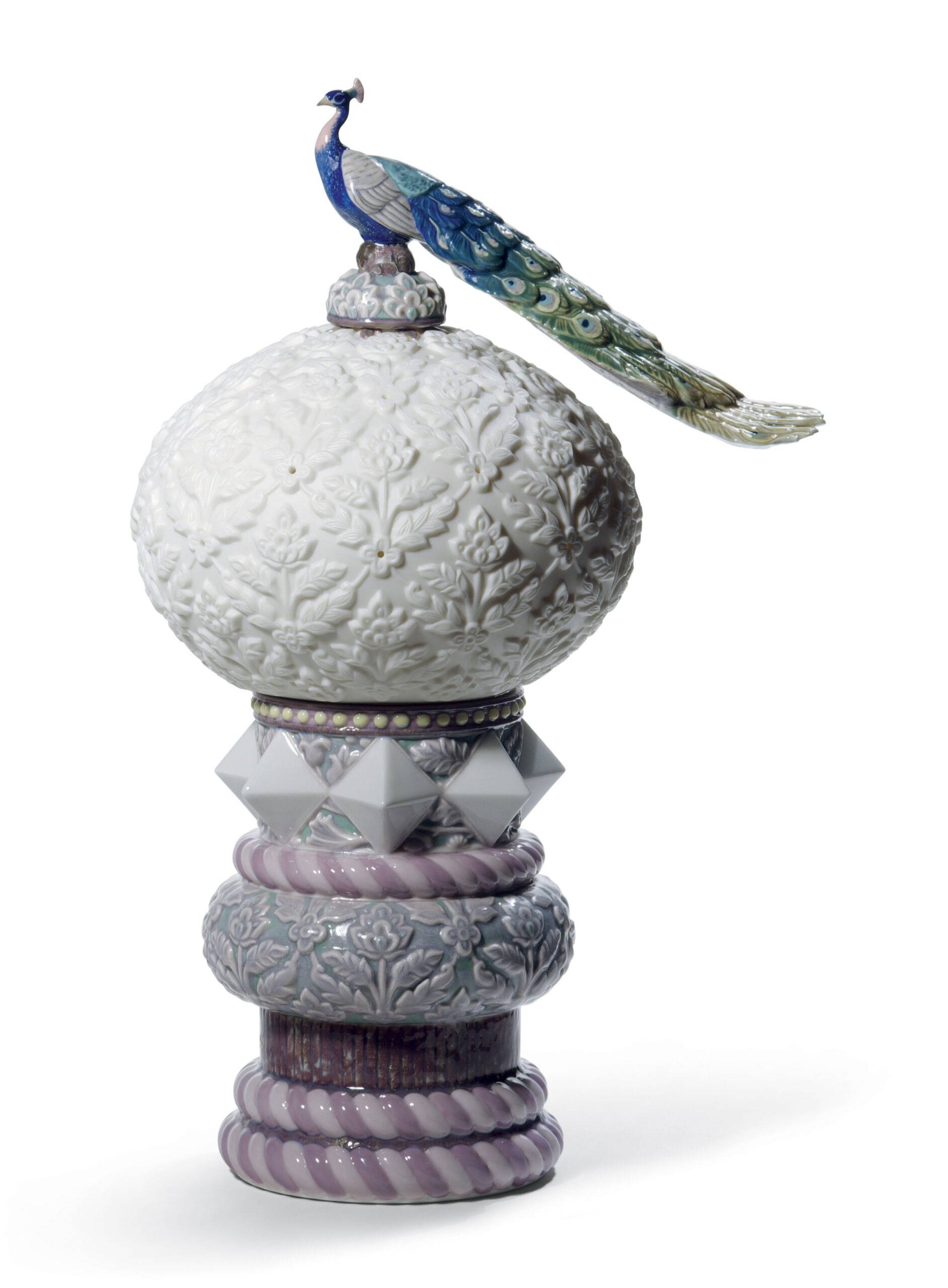 LladrĂ³ table lamps combine functionality with beauty and sculptural perfection. With a strong Hindu inspiration, this piece combines the realism of the peacock that crowns it with the geometric volumes and the rich floral ornamentation. Good luck, harmony, serenity, peace of mind, relaxation and protection are the features associated with this splendid bird, with a meticulous treatment of the plumage, where the ornamental work and careful selection of the chromatic range help to enhance the beauty of this piece. The lampshade is made of Matte white porcelain, so when illuminated, its transparency allows the light to further enhance the floral motifs of the engravings. A perfect decorative complement to bring an exotic element to all types of environments.