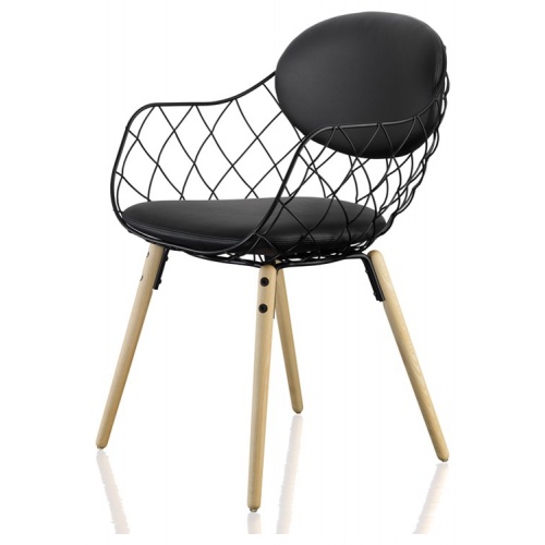 Piña was born of the desire to create a new seating concept, combining comfortable woven steel rods with solid wooden legs.