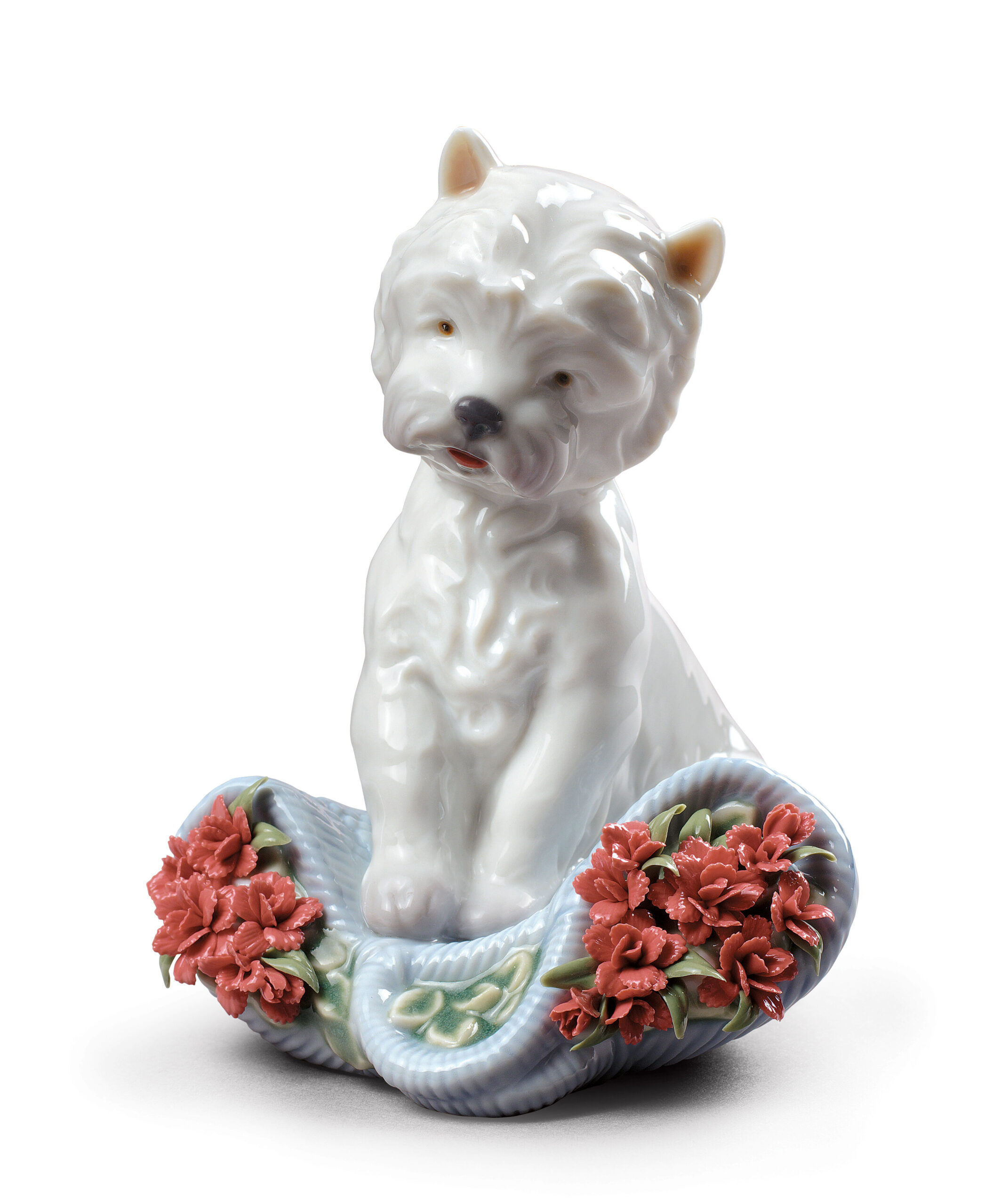 This Westie puppy has knocked over the basket of beautiful carnations while playing, but its ownersaren’t annoyed: who could ever be angry with such a delightful pet? A glossy porcelain creation decorated in soft pastel colours, perfect as a gift, a collectible or a decoration.