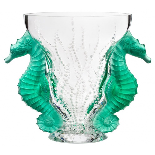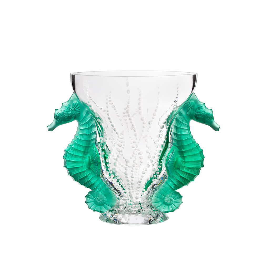 The Poséidon vase portrays the image of Poseidon’s mist covered chariot emerging from the sea. Working with the crystal heated to very high temperatures, Lalique’s master artisans have perfected the delicate ancient process that joins the two seahorses to the body of the vase.