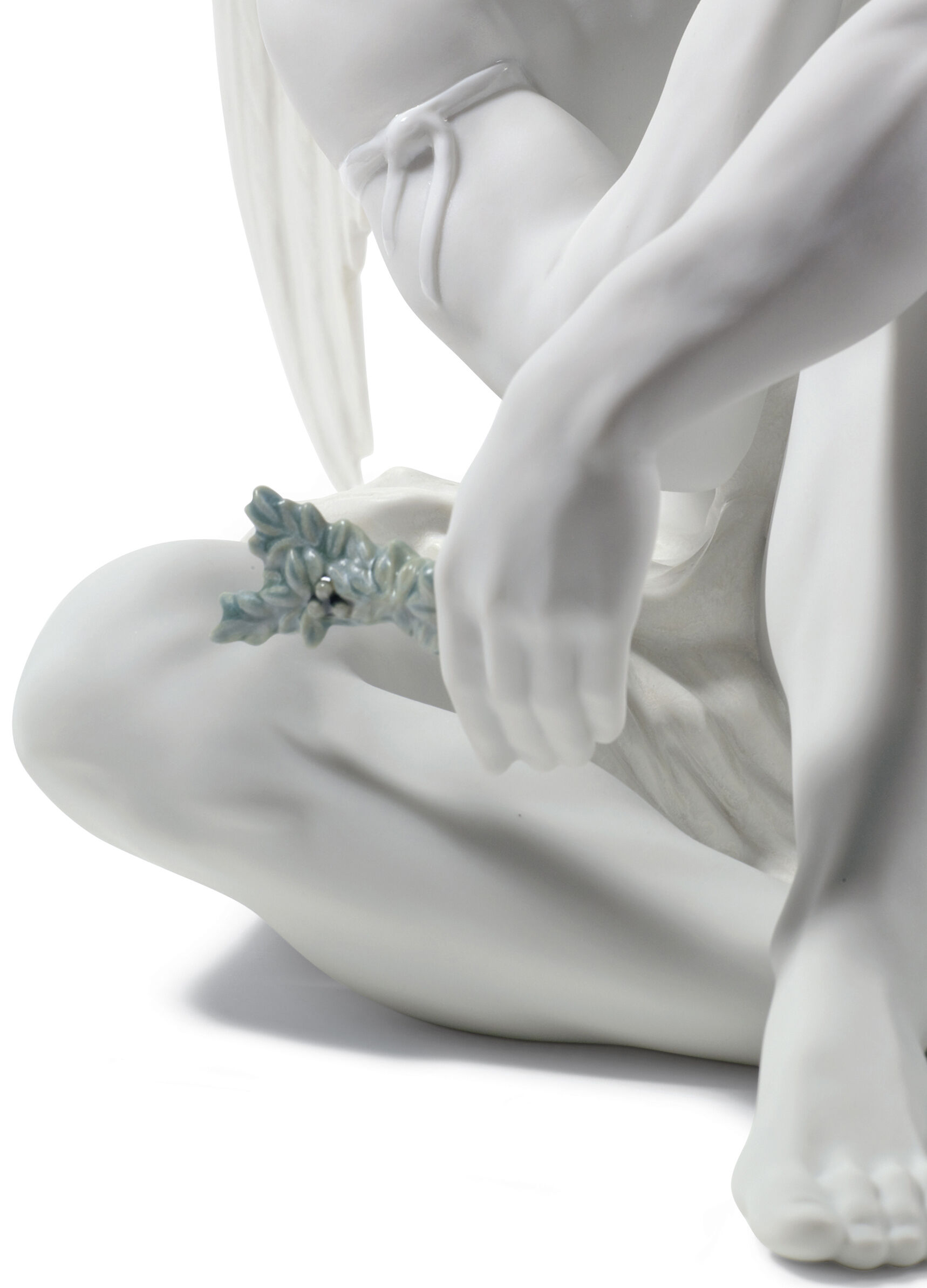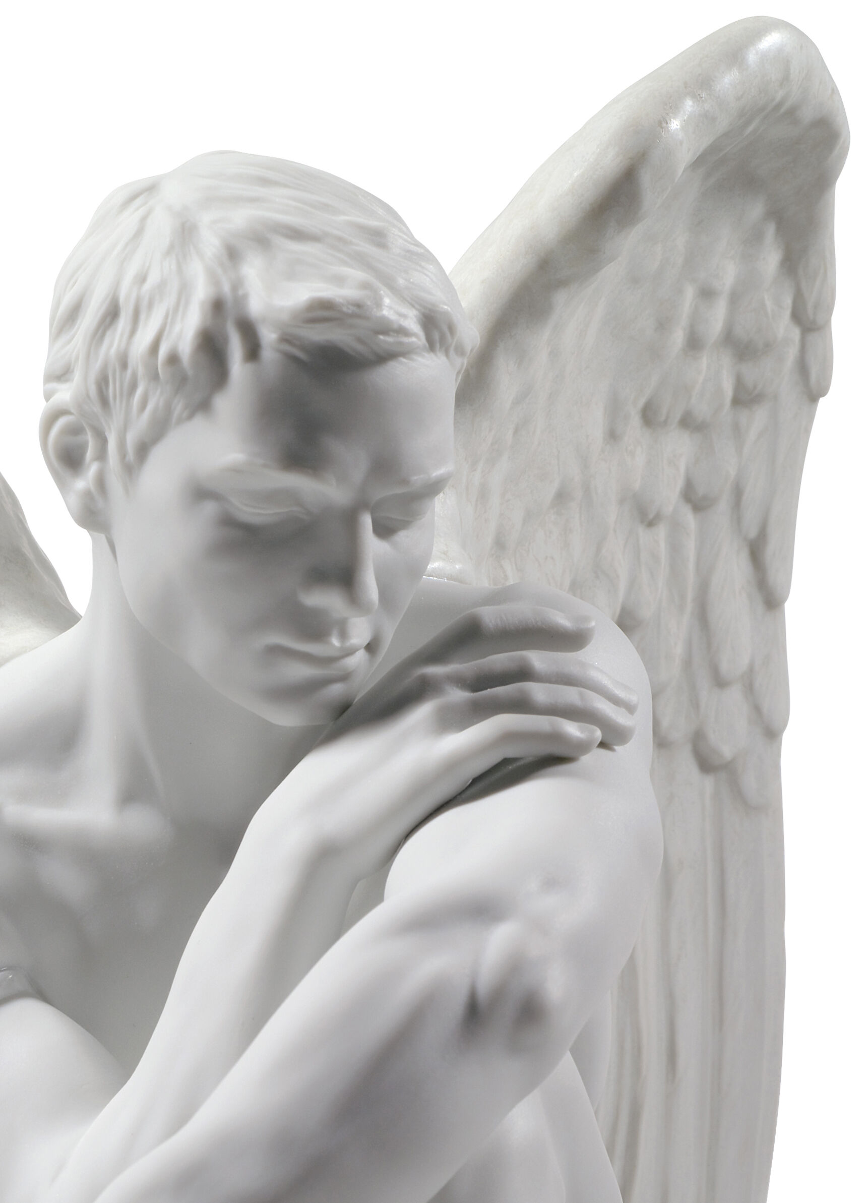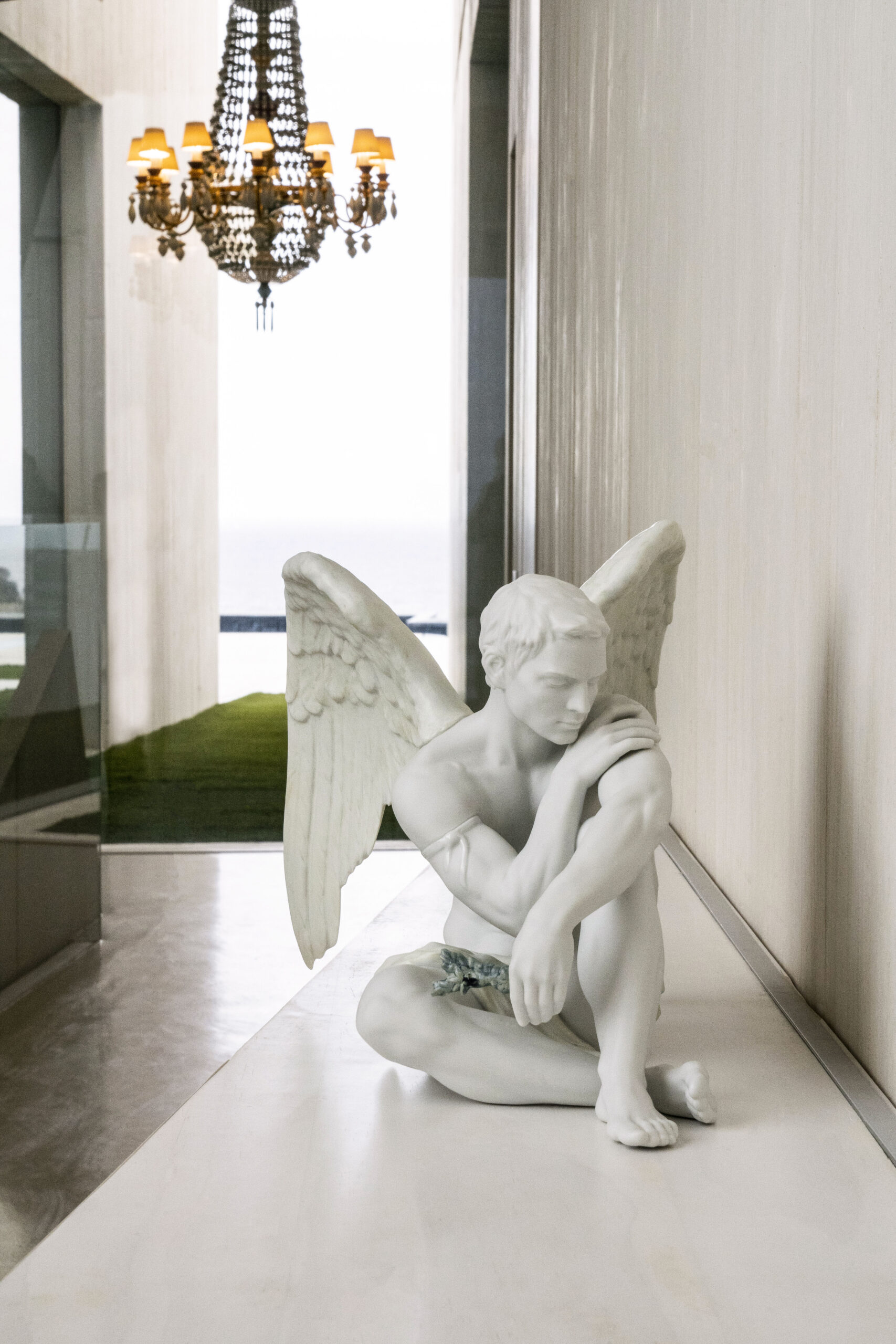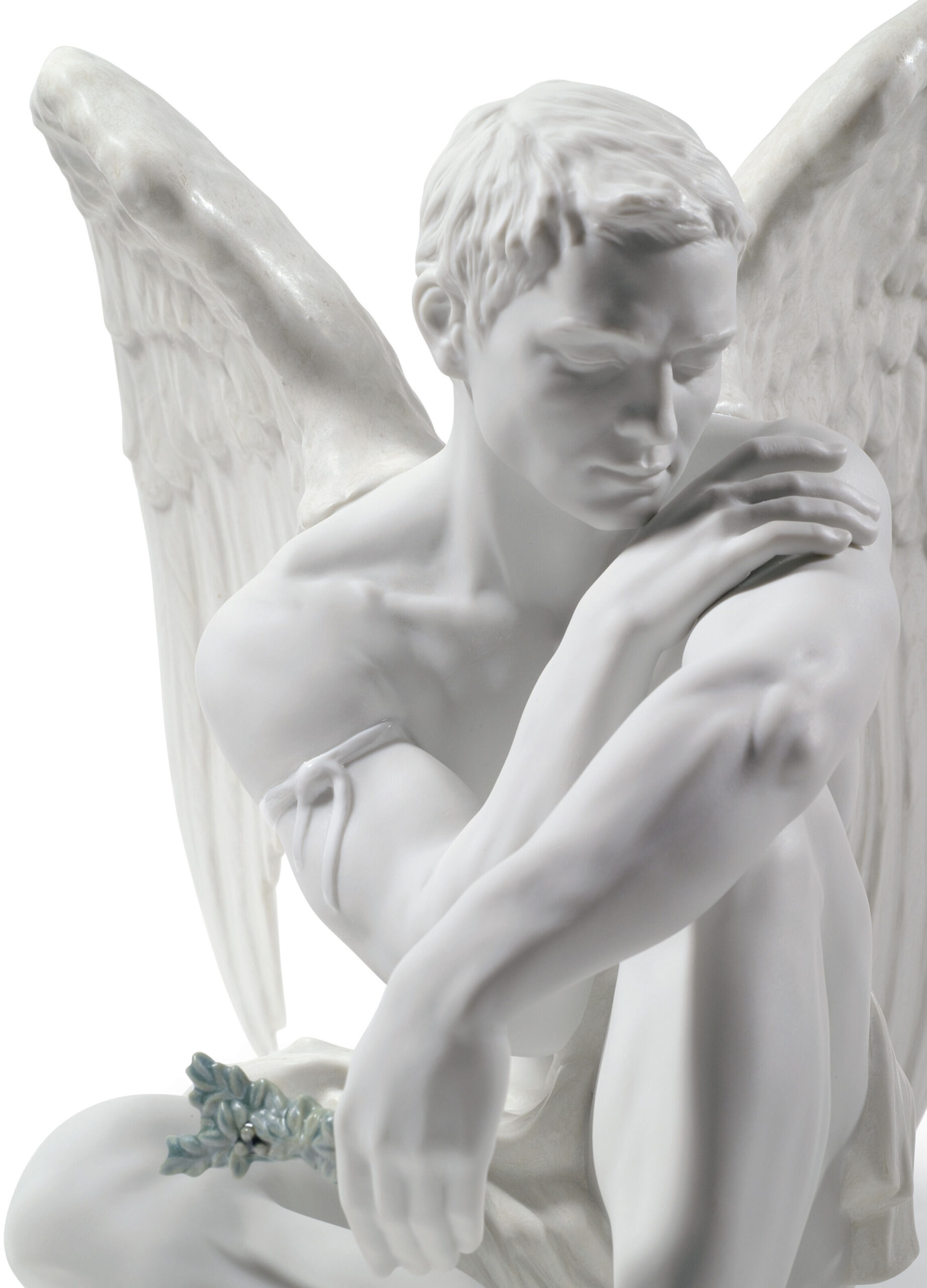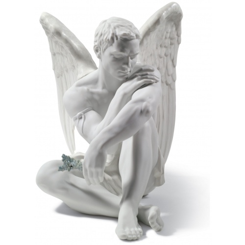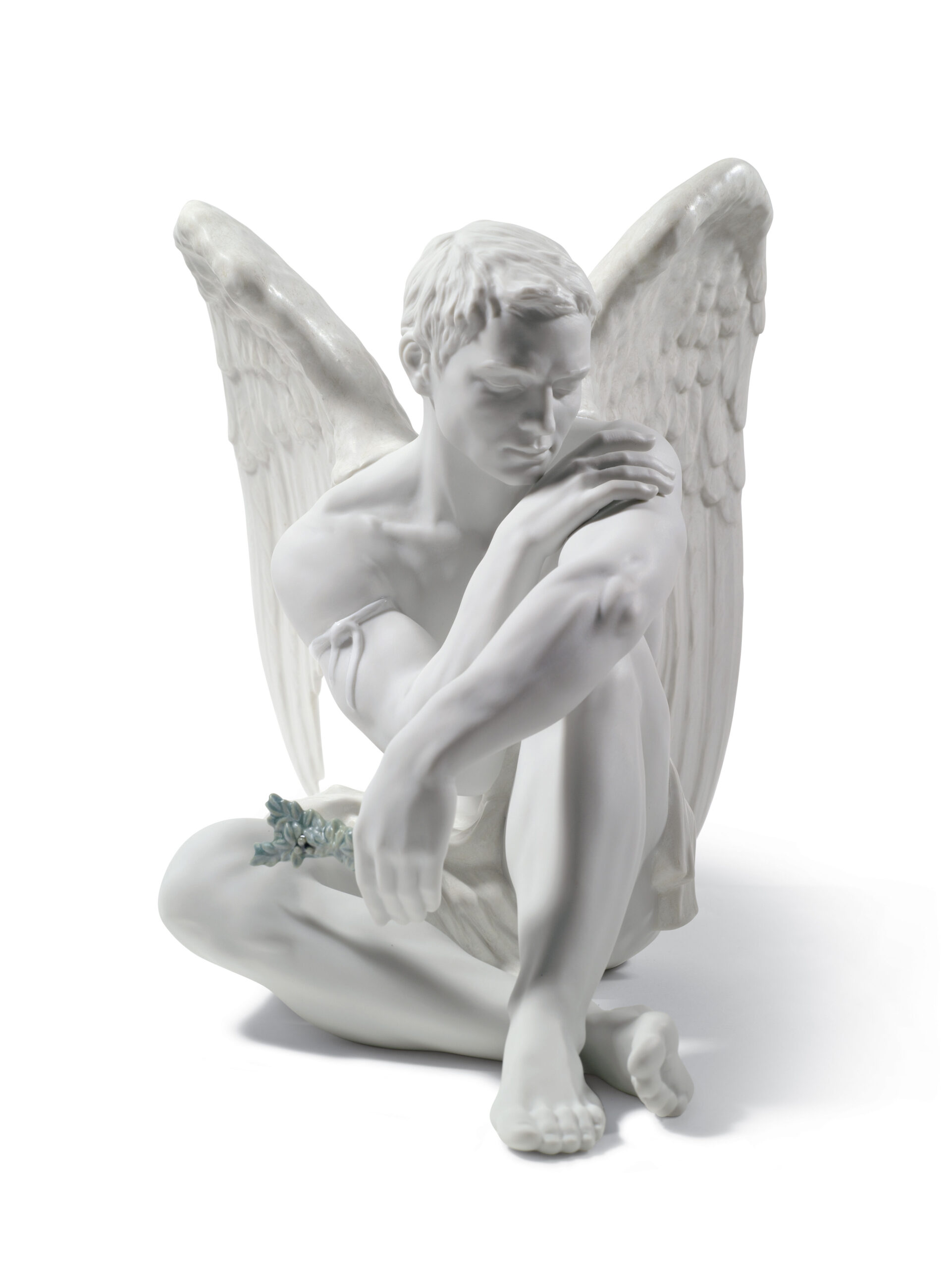 A masculine figure, poised and powerful but calm. This angel who carries an olive branch in his hand is a protective, majestic and spiritual symbol. Made in matte white porcelain and decorated with details in soft colour, this piece stands out for its perfect modelling. Ideal as a gift or decoration.