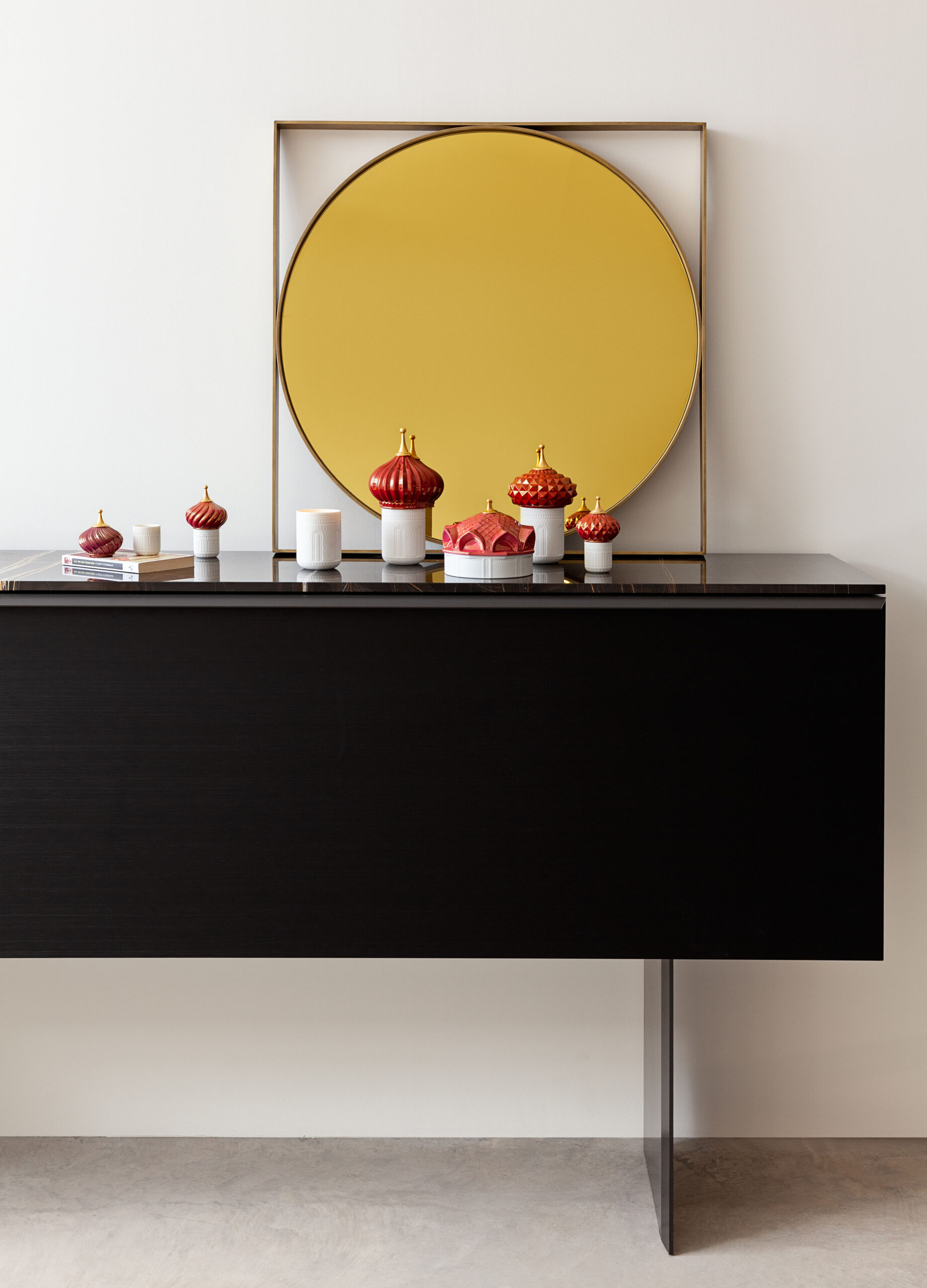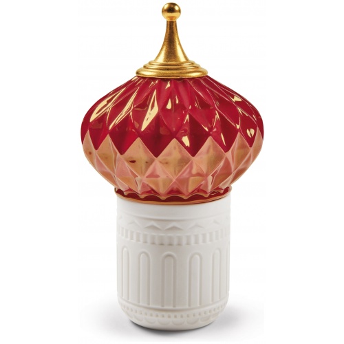 The covers are painted in different tones of red with a gold lustre finish. The candle vases are made of translucent porcelain, which filters the passage of light.
