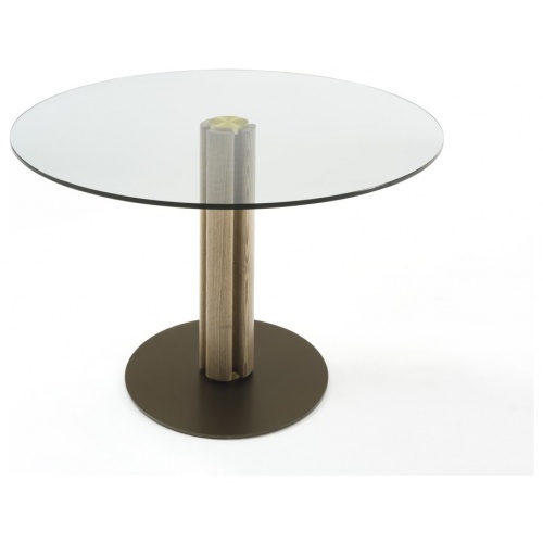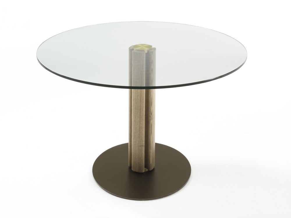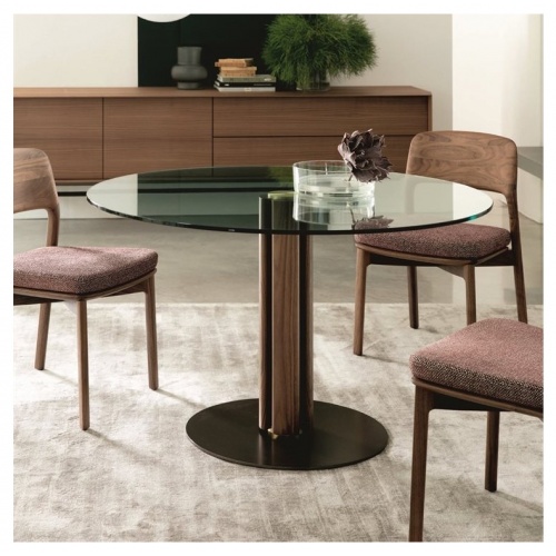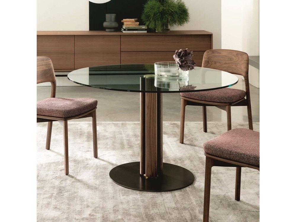 Perfect for any contemporary dining space, this modern round glass dining table by Porada is characterised by its central solid canaletta walnut base and brushed brass detailing.