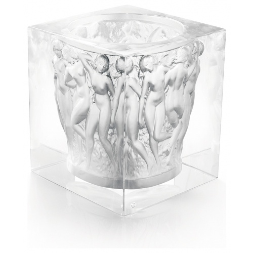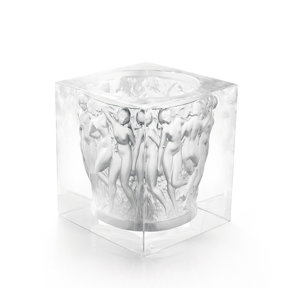 Produced by the lost wax technique, the Revelation Bacchantes Vase appears as if a Bacchantes Vase is suspended in a cube of crystal. A very difficult piece to produce, the Revelation Bacchantes Vase requires several weeks to be completed by the talented and devoted artisans of Lalique.