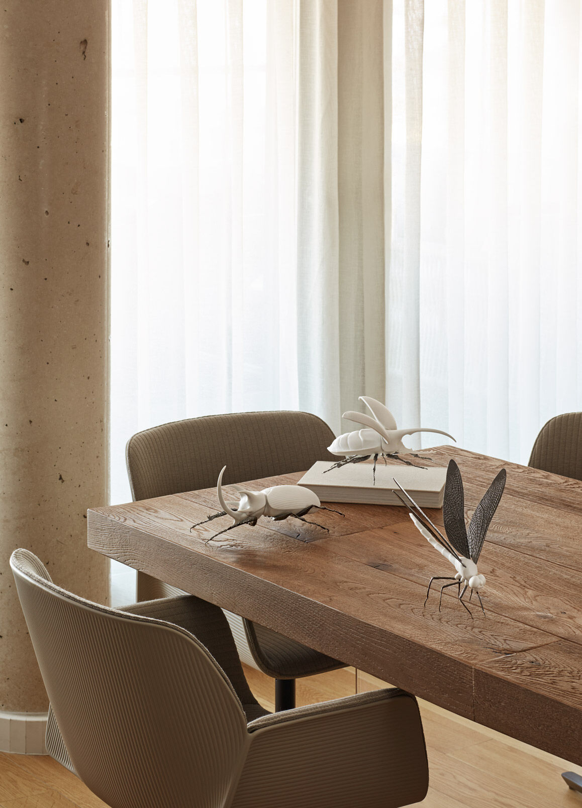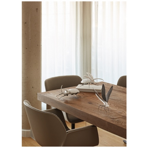 The insects that made a successful debut decorated in intense colors are now available in pure white, combined solely with the graphite grey of the metal parts. The absence of other colors underlines the wealth of the material itself, its details and forms.