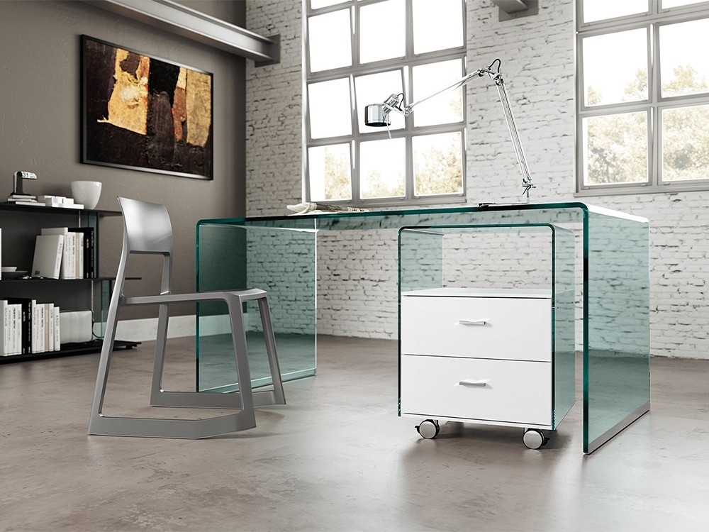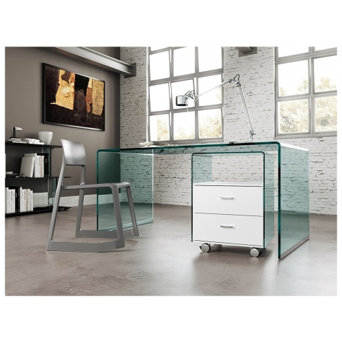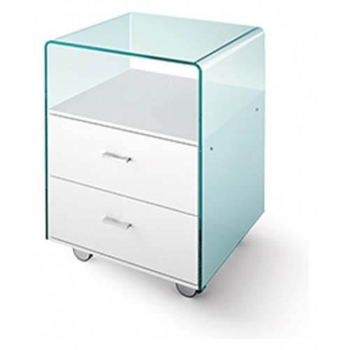 Designed by CRS Fiam, this elegant drawer unit exudes the grace and charm reminiscent of Italian design. Crafted from 8mm curved transparent glass with a white lacquered wood frame, this drawer unit is perfect for any contemporary home office.