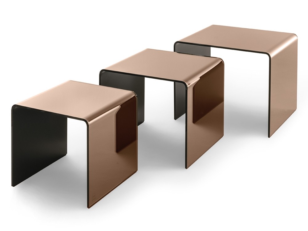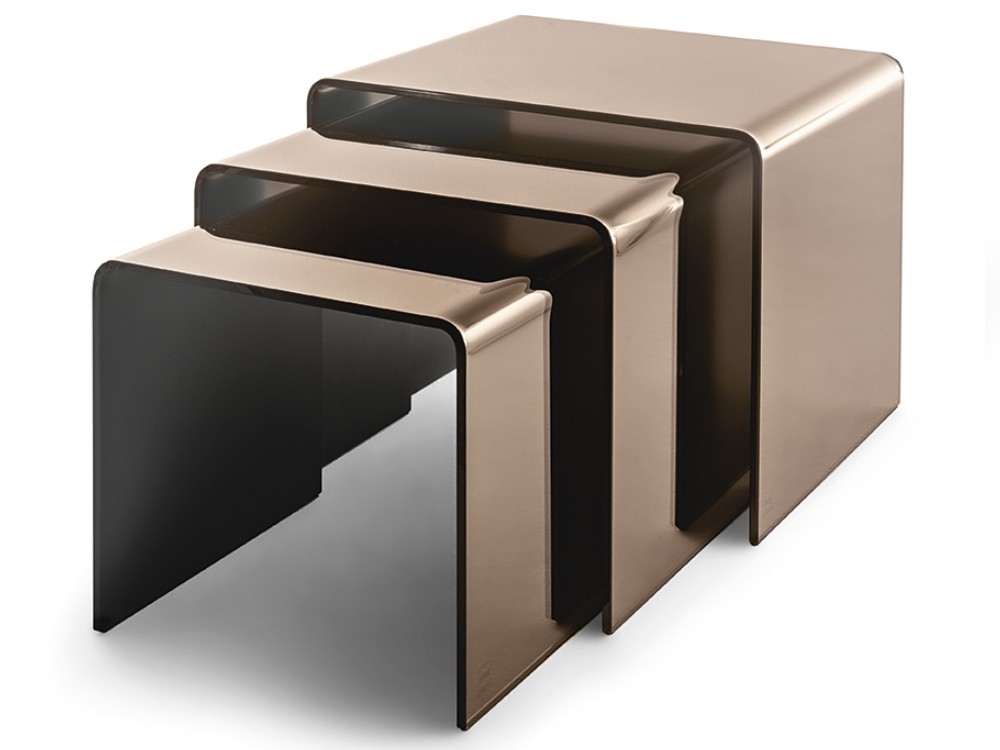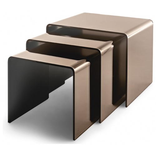 Now you see them, now you don’t. Perfect for hosting, the Rialto Tris Nesting Tables slide elegantly together, gifting flexibility and style in all your household endeavours. Pictured here in back-silvered glass bronze glass, the trio add a touch of warmth to contemporary interiors.