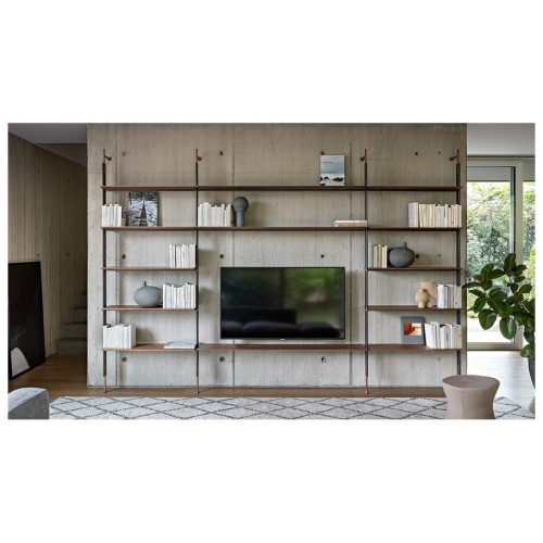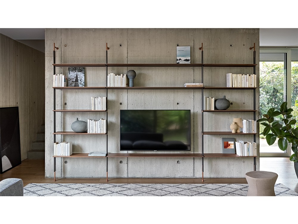 Roll is a modular bookcase designed to furnish spaces with an architectural presence, reminiscent of the industrial style.