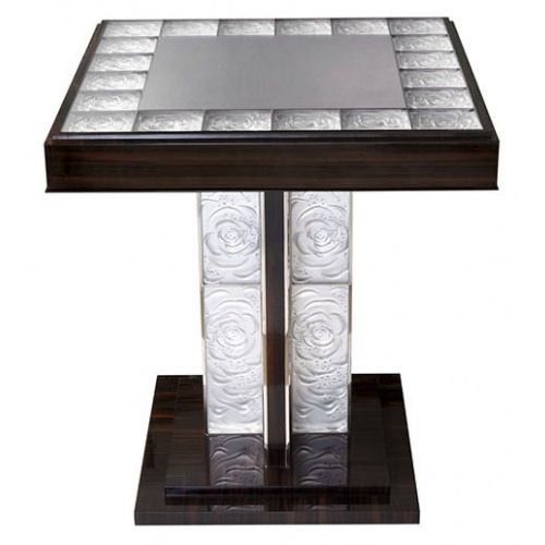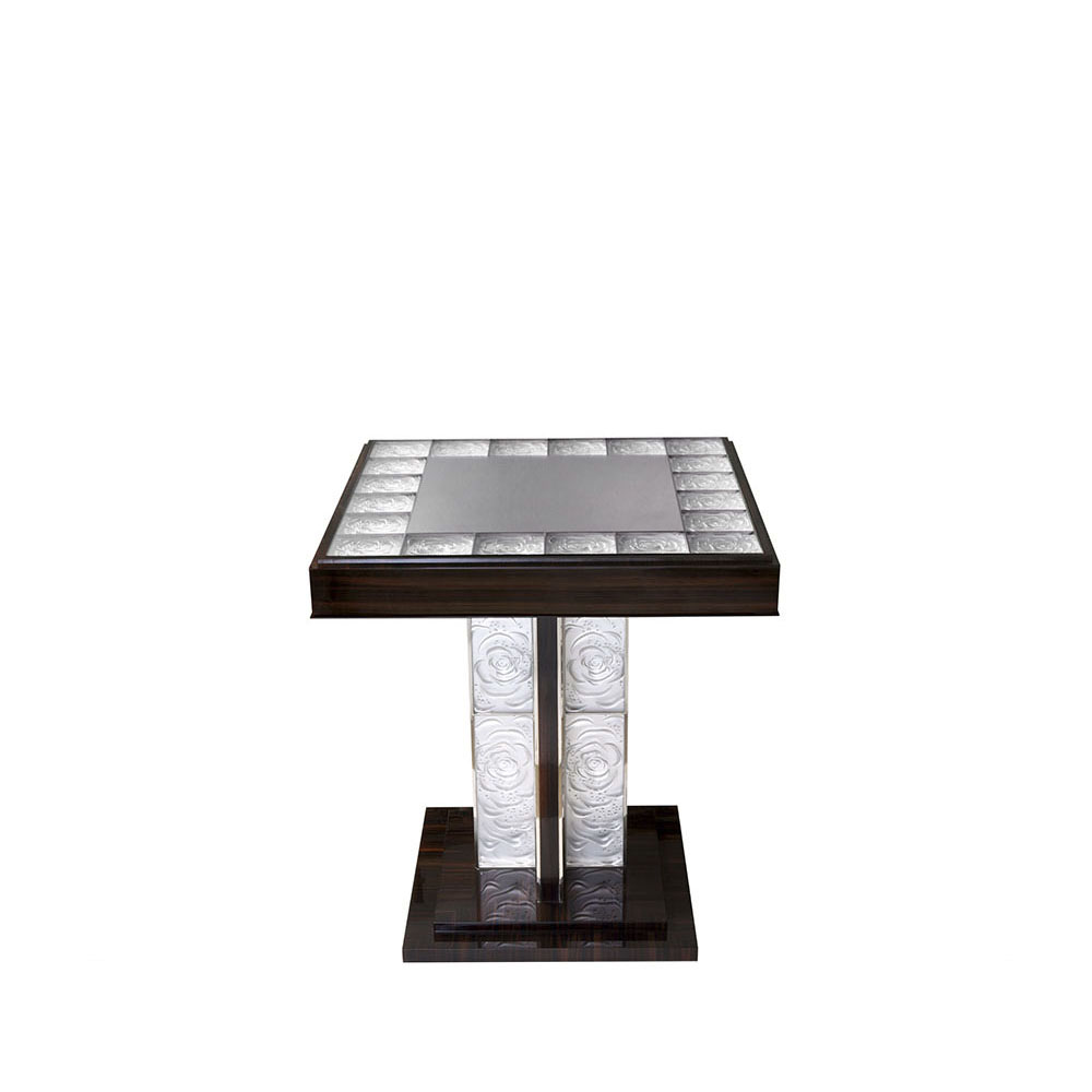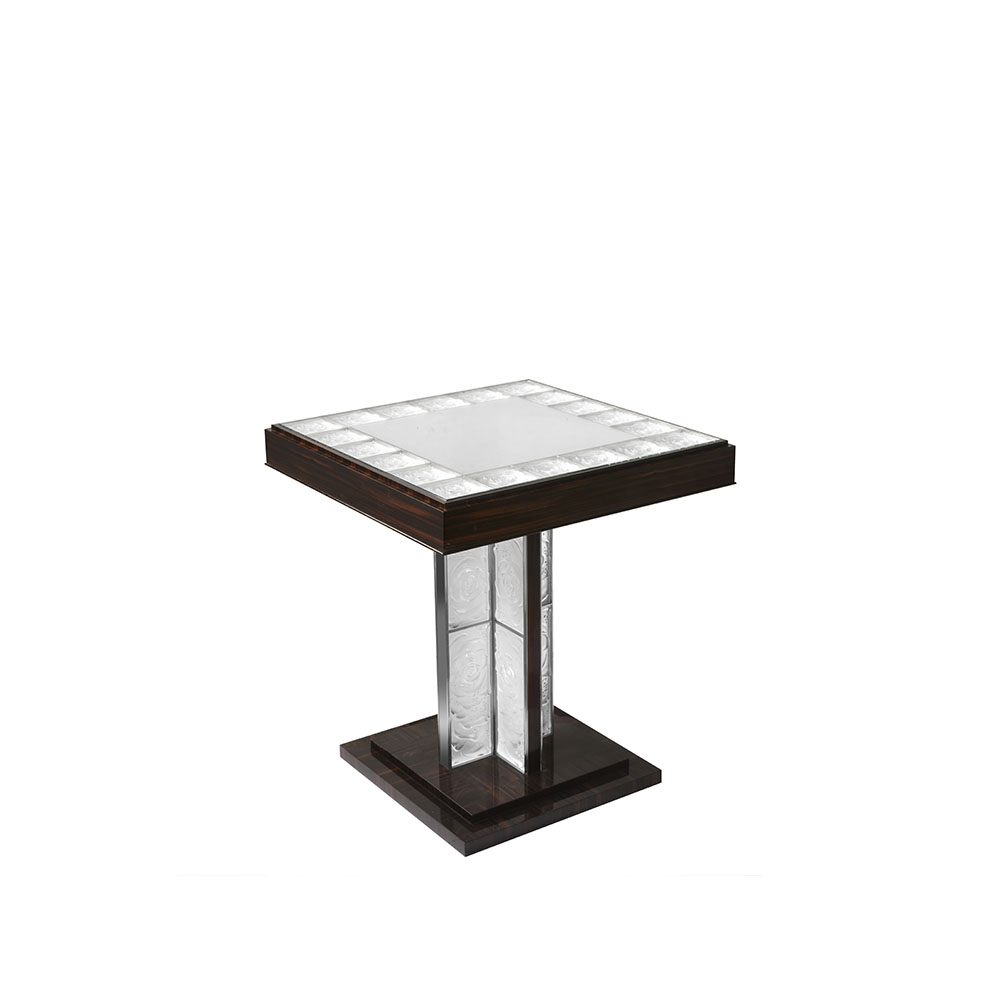 Designed by Pierre-Yves Rochon, the Roses and Soudan pedestal tables are jewels of interior design. A beautiful result of the encounter of many exceptional savoir-faire, it combines aesthetics and functionality. Metal and macassar sublimate the purity and brilliance of crystal. Finely chiselled in relief, the motif of Roses is highly symbolic while the Art-Deco inspired Soudan design displays geometric lines composed in a regular and dynamic movement.