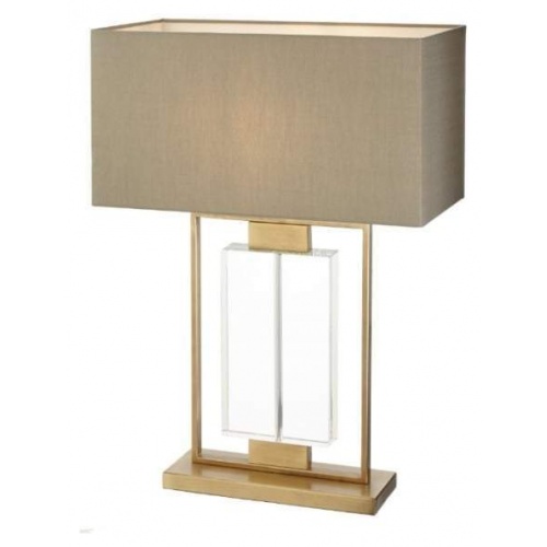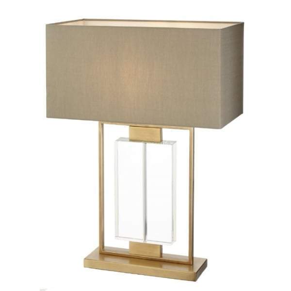 - The Ryston Table Lamp finished in antique brass and crystal with a grey rectangular shade is pleasing to the eye and is a striking designer lamp that will add a sculptural element to any interior.