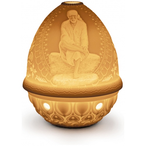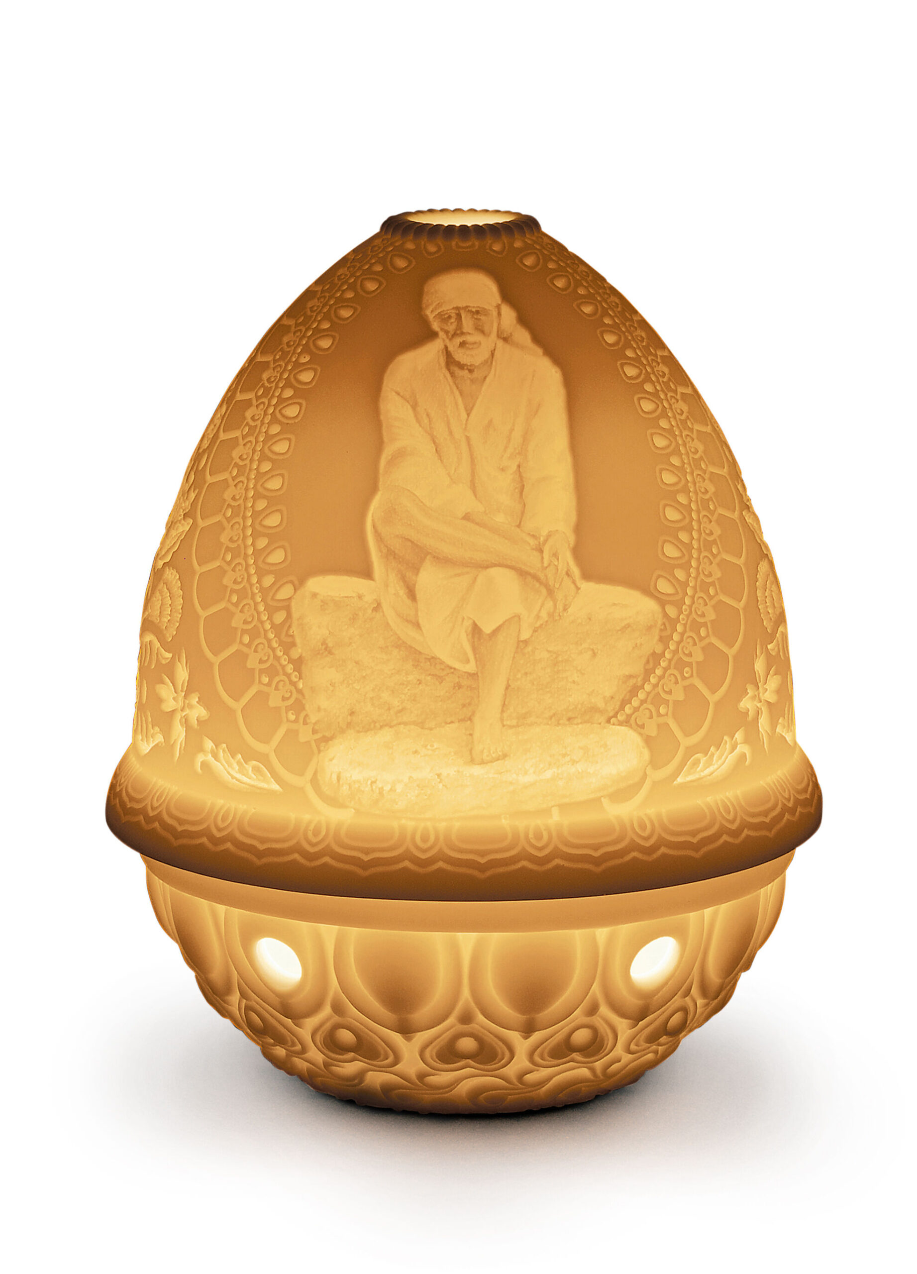 The magic of lithophany is born from the play of light with the translucent character of porcelain. By illuminating its interior, it projects warm lighting throughout the room and highlights the engraving that decorates it, producing surprising relief effects on its surface. This piece depicts Sai Baba, considered by his many Hindu and Muslim devotees to be a saint, a spiritual and good man who had no appreciation for perishable things and was always concerned about self-realization. An austere and kind personality who, a century after his death, continues to arouse the admiration and respect of millions of people around the world.