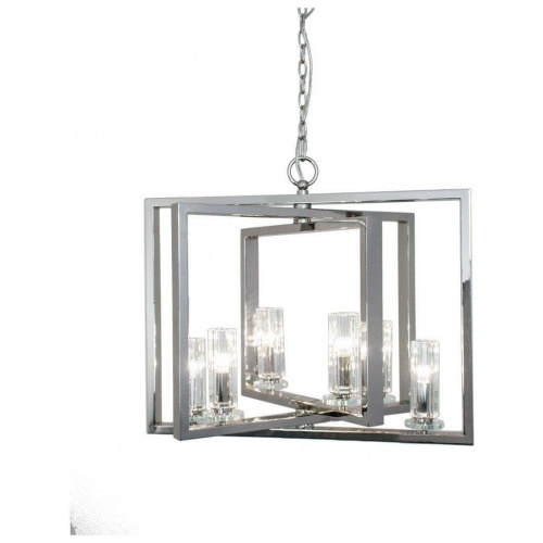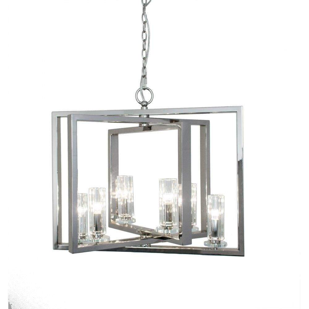 - Structured contemporary 6 arm chandelier, comprised of 3 nickel rectangle rings, all attached by a central point. Each rectangle has 2 light fittings, where the bulbs are encased in glass tubes.