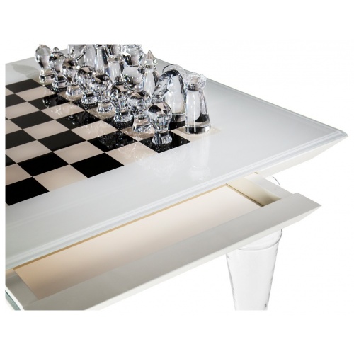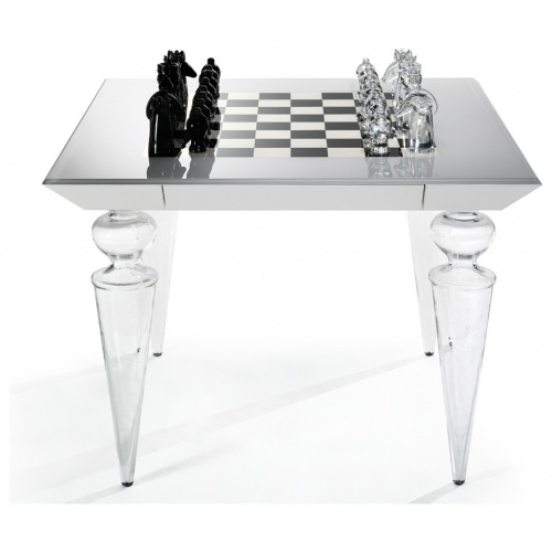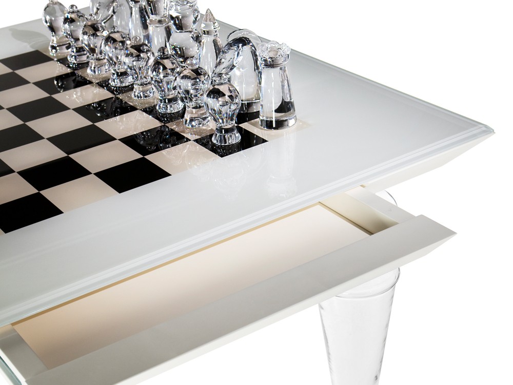Designer chess table by Riccardo Lucatello for Reflex Angelo featuring Reflex’s signature Murano glass legs and a contrasting coloured glass top.