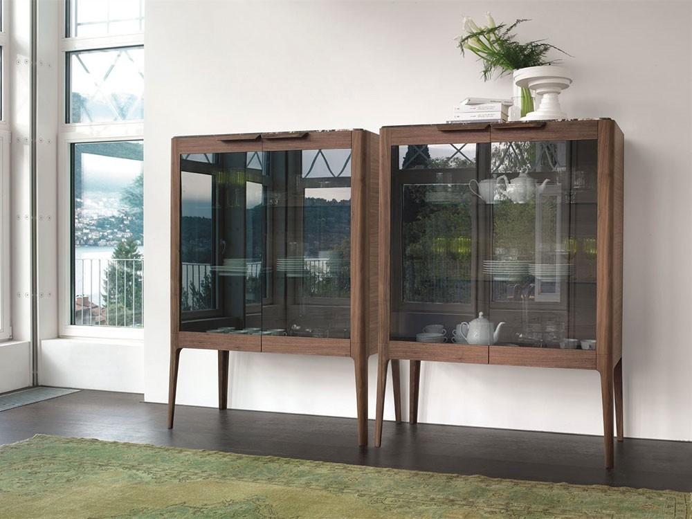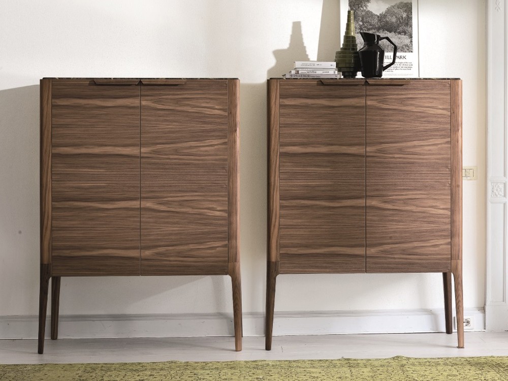 Modern cabinet in canaletta walnut with two wooden doors and top in marble. Glass internal shelves.