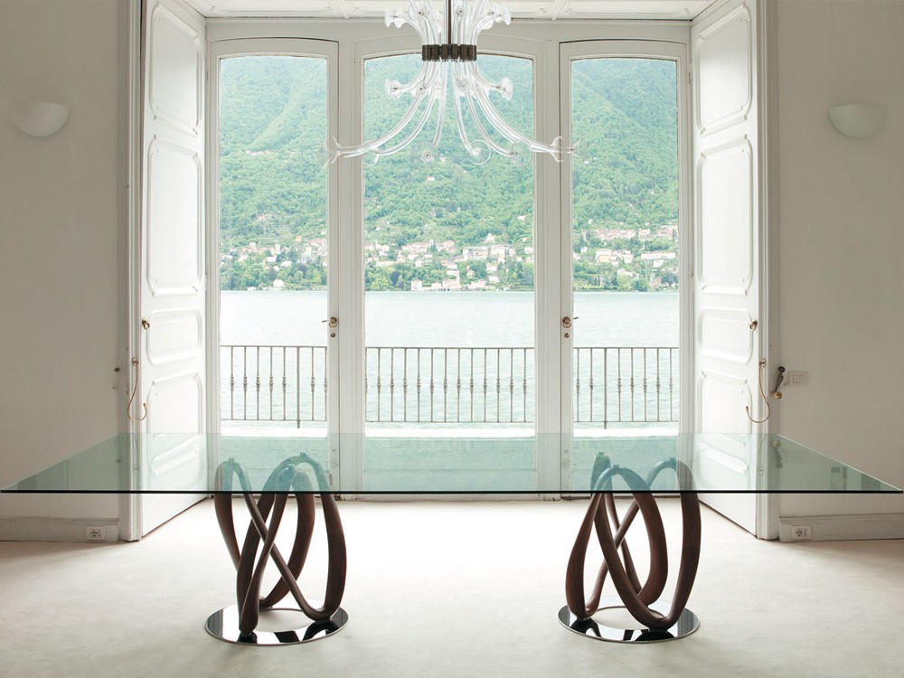 Contemporary dining table designed by Stefano Bigi for Italian manufacturer Porada. This eye-catching rectangular glass dining table features an elegantly sculpted base and is available in Canaletto walnut.