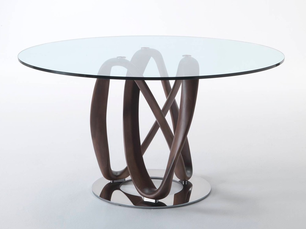 Contemporary dining table designed by Stefano Bigi for Italian manufacturer Porada. This eye-catching glass round dining table features an elegant sculptured base in Canaletto walnut with a contrasting base ring in chrome.