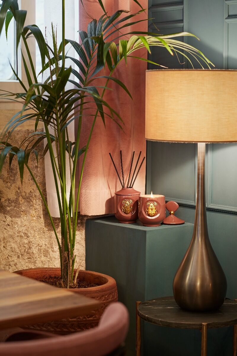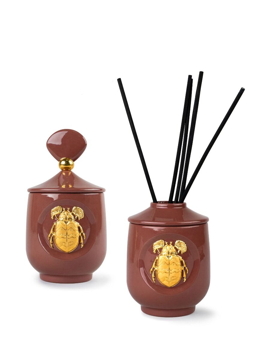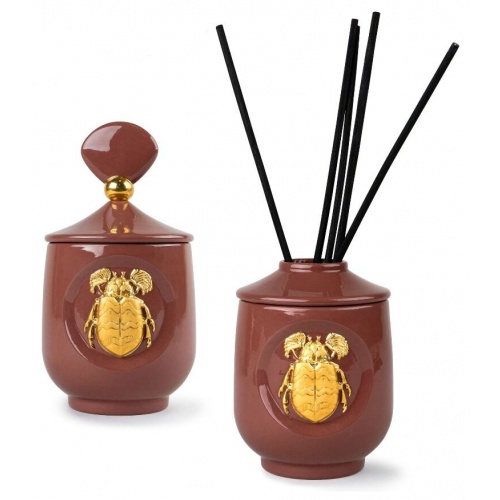Celebrating the incredible variety of the animal kingdom, the Luxurious Animals collection is the latest addition to the world of home fragrances. Porcelain holders on which different animals have been finely etched by hand and painted with golden luster. In this case, the candle and the diffuser are decorated with a scarab. The candle contains 500 grs of natural wax and two wicks and the diffuser 200 ml of essence and five black diffuser reeds measuring 24 cm. The scent of both is Moonlight, a fruity fragrance with hints of orange and pineapple and a base of amber and vanilla.