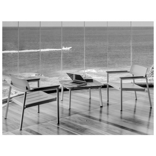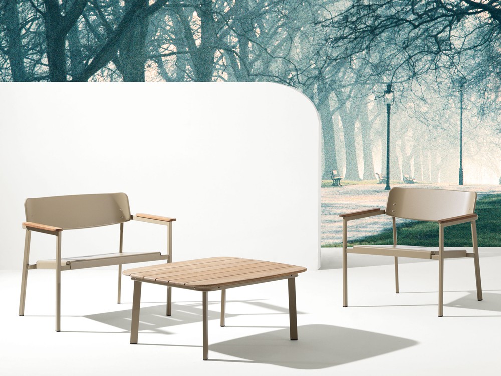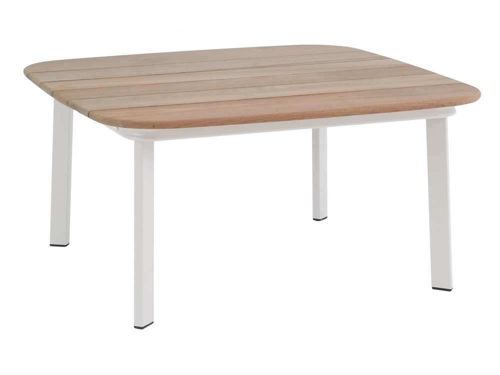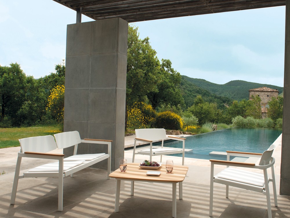 Full lines and an essential design, the Shine outdoor coffee table in aluminium and teak can transfer indoor furniture outdoors.