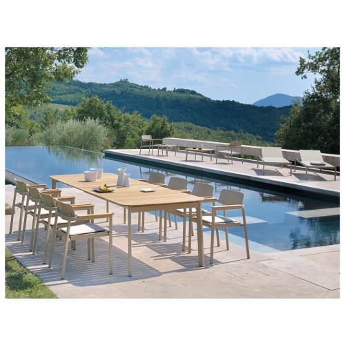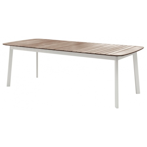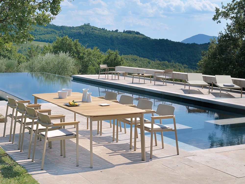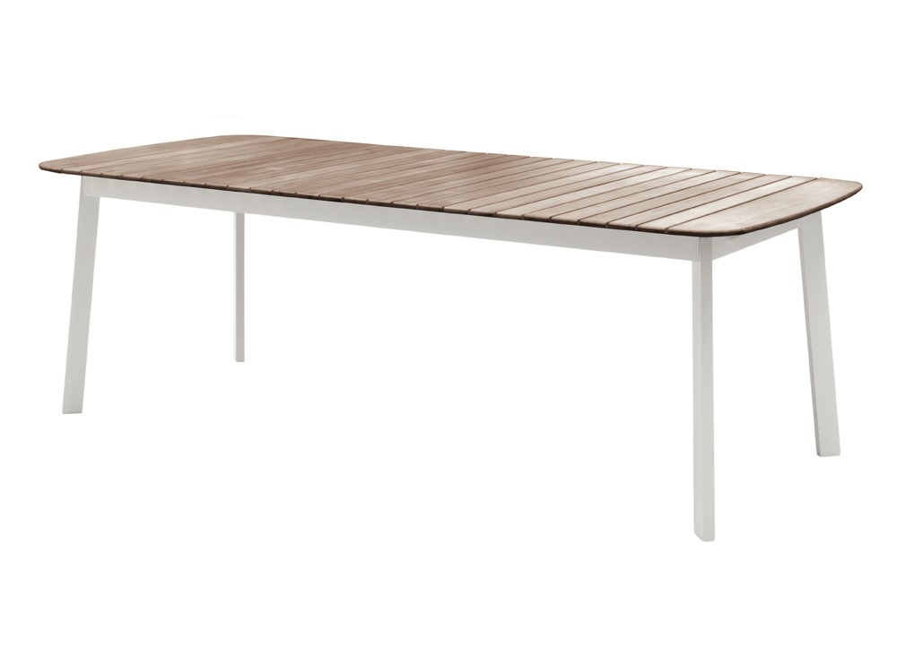 Full lines and an essential design, the Shine outdoor dining table in aluminium and teak can transfer indoor furniture outdoors.