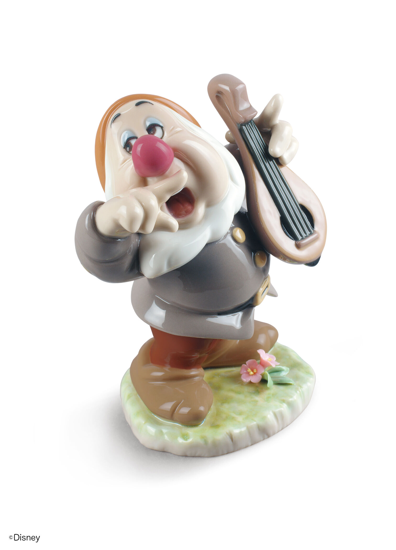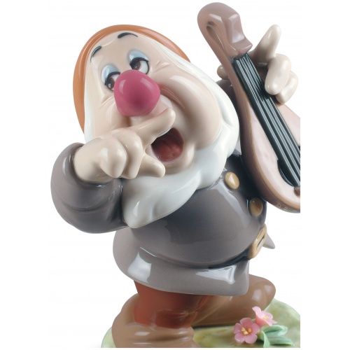 Sneezy is a porcelain sculpture that reproduces one of Snow White’s companions. It’s a fictional character based on the Grimm brothers’ tale, where a princess meets a group of seven dwarfs when she runs away from her evil stepmother, who has ordered her to be killed to be more beautiful in the kingdom. Finished in glossy porcelain and decorated with the character’s characteristic colors. The piece has two pink flowers and a commemorative Disney 80th anniversary decal on its base. This figure is part of a collection of Disney related and collectible pieces that can be purchased separately or together: 01009320, 01009321, 01009322, 01009323, 01009324, 01009325, 01009326. Made in Spain.